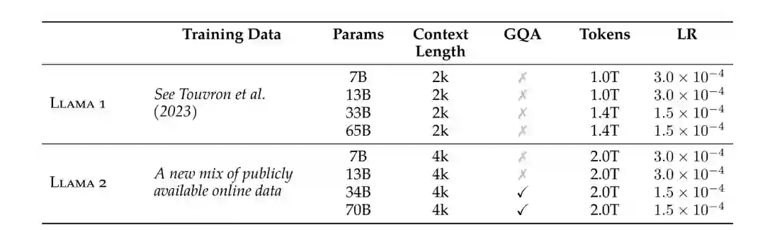 Llama-2使用了和Llama-1相同的模型架构以及tokenizer。与Llama-1不同的是,Llama-2将上下文长长度扩展到了4k,并且34B和70B参数量版本使用了GQA。