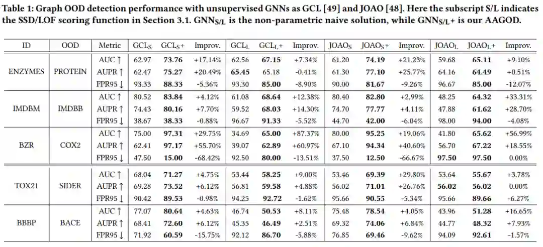 为了验证AAGOD的有效性,我们在来自不同领域的真实世界数据集上进行了广泛的实验,并考虑了四个模型作为训练良好的GNN,包括两种无监督方法GCL、JOAO和两种监督方法GIN、PPGN。实验结果显示,AAGOD可以成功地赋予训练良好的GNN 检测分布外数据的能力,并且与典型的基于重用的方法相比,其在AUC中的平均相对增强为25.21%。此外,AAGOD在图OOD检测中超越了最新的方法,与最佳基线相比,其在AUC上的平均相对增强为6.21%。此外,我们的AAGOD的训练速度比现有的图OOD检测方法快34倍,因为我们不需要训练GNN编码器。最后,我们还通过可视化研究了学习到的放大器的可解释性。