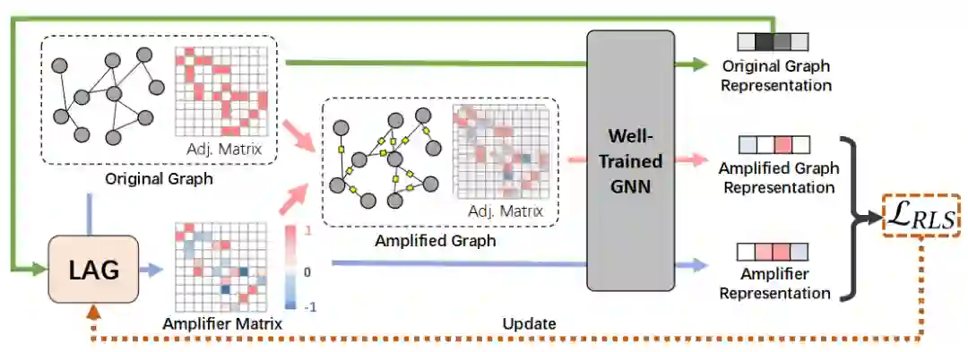 为了解决上述困难,我们提出了一个名为AAGOD的新框架:(1)为了处理具有不同大小和无序节点的图,我们创新地设计了一个可学习的放大器生成器(LAG),以自适应地生成特定于图的放大器。LAG将利用由训练良好的GNN编码的节点表示来为原始图中的边生成权重。通过这种方式,可以进一步复用训练良好的图编码器中的知识,并且LAG可以定制放大器来确定图的哪一部分应该被强调以进行OOD检测。(2)为了在没有OOD数据的情况下训练LAG中的参数,我们提出了一种正则化学习策略(RLS),该策略鼓励放大的ID图得高分,并期望在只看到放大器时得到低分。通过这种方式,我们可以确保导致高分(即ID模式)的关键因素只存在于ID图中,而不是放大器中。相比之下,由于LAG没有被训练来感知与ID图的模式大不相同的OOD图,因此放大的OOD图的得分将保持较低。