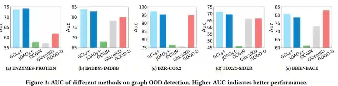 为了验证基于重训练良好的GNN来检测OOD图是可行的,我们也将基于GCL和JOAO的AAGOD与三种基线方法进行比较。下图显示了五种方法在五对数据集上的AUC。