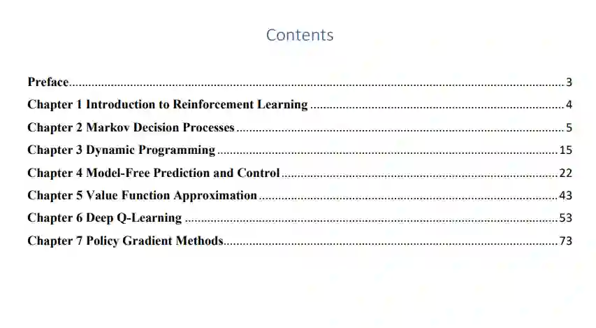 这本手稿涵盖了强化学习的所有重要的基本方面。第二章采用马尔可夫决策过程对主体与环境之间的相互作用进行建模。第三章介绍了基于给定环境模型解决MDP问题的核心技术——动态规划。一般来说,解决MDP问题涉及到政策评估和政策改进的迭代。在第四章中,我们讨论了无模型方法:蒙特卡洛,TD学习,SARSA和q学习。第五章对强化学习中的值函数逼近进行了一般讨论。作为一个重要的例子,深度Q-learning将在第6章中详细介绍。第7章介绍了策略梯度方法,重点介绍了策略梯度定理、REINFORCE算法、Advantage Actor-Critic算法等基本概念。