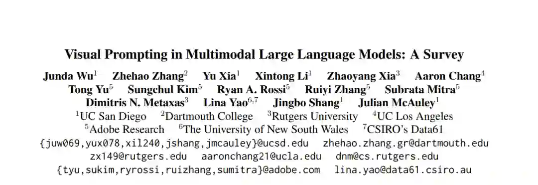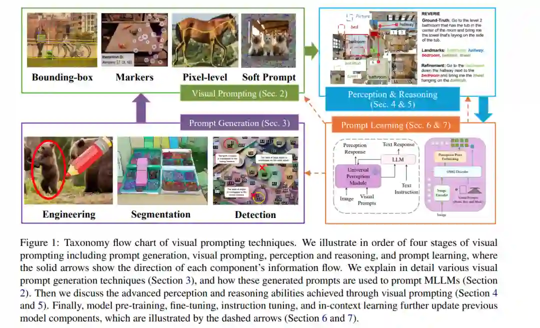 多模态大语言模型(MLLMs)增强了预训练的大语言模型(LLMs)以实现视觉能力,从而在复杂的多模态任务上实现视觉理解和推理。然而,由于使用文本提示描述和指定视觉元素的局限性,传统提示方法在提供准确的视觉基础和详细视觉信息的引用上表现不佳,这可能导致视觉幻觉和语言偏见。 最近,视觉提示方法作为一种新范式应运而生,补充了文本提示,使得在多模态输入上能够进行更细粒度和像素级的指令。由于视觉提示方法可以采取多种形式,且常常在像素级粒度上操作,通用的提示模板可能不适用于不同的图像,这使得实例级视觉提示生成变得必要。因此,我们在第二部分提供了当前视觉提示方法的全面分类,并在第三部分介绍了生成这些视觉提示的方法。