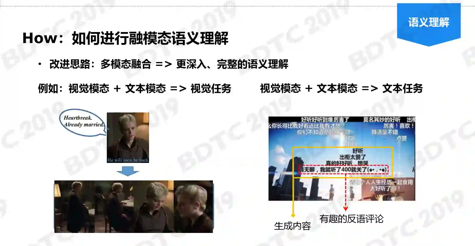 然而获取语义信息存在极大的挑战,从理论层面来说,机器不理解人的思维方式,这样会导致“语义鸿沟”的现象;数据层面,缺乏规范化标注语料,各模态信息难以解释与关联。因此本教程中提出通过融模态语义理解和多模态语义关联来加深层次语义理解。