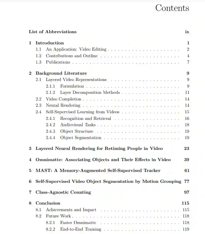 为了将物体与其相关的视觉效果自动分组,我们采用了一种分层的方法:我们的目标是将视频分解成特定的物体层,其中包含所有与物体一起移动的元素。这些层的一个应用是,它们可以以新的方式重新组合,以产生一个高度真实的、经过改变的原始视频版本(例如,删除或复制物体,或改变其运动的时间)。这里的关键是利用卷积神经网络的自然属性来获得输入视频的分层分解。我们设计了一个神经网络,通过对视频的过度拟合,为视频输出层。我们首先介绍了一种针对人类的方法,然后展示了如何将其适应于任意的物体类别,如动物或汽车。我们的第二个任务是视频物体分割:为视频中的物体产生像素级的标签(段)。我们以前的工作是在单个视频上进行优化,而在这里,我们采取了一种数据驱动的方法,以自我监督的方式对大量的视频语料库进行训练。我们考虑了两种不同的任务设置:(1)半监督物体分割,即为单一帧提供初始物体掩码,该方法必须将该掩码传播到其余帧;(2)移动物体发现,即不提供掩码,该方法必须分割突出的移动物体。我们探讨了两种不同的输入流。RGB和光流,并讨论它们与人类视觉系统的联系。