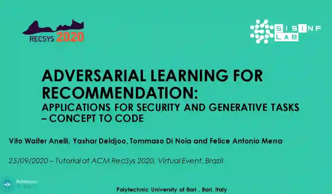 第14届推荐系统顶级会议ACM RecSys在9月22日到26日在线举行。来自意大利Polytechnic University of Turin做了关于对抗推荐系统的教程《Adversarial Learning for Recommendation: Applications for Security and Generative Tasks – Concept to Code》,186页ppt,干货内容,值得关注。
