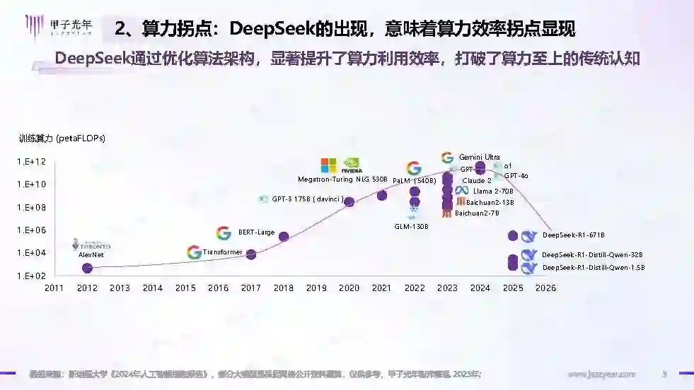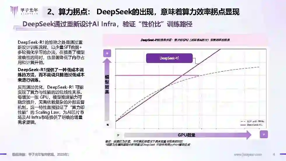 人工智能的发展已到战略拐点 经过近七十年的发展,人工智能自出现至今其核心能力一直在提升,到如今已经成为覆盖感知、认知、决策、学习、执行、社会协作能力,未来还会向符合人类情感、伦理与道德观念的智能机器迈进。 发展到现在,人工智能的技术能力已经到了一个拐点,即从技术能力驱动向需求应用驱动转型的关键时期。随着技术能力的提升,技术进化引发经济进化,从旧范式抵达新范式。如今人工智能的发展已经处于从第三阶段向第四阶段过渡的时期。人工智能的能力成长历程已经足够长,到了寻找需求的战略拐点。 算力拐点:DeepSeek的出现,意味着算力效率拐点显现 DeepSeek通过优化算法架构,显著提升了算力利用效率,打破了算力至上的传统认知DeepSeek通过重新设计AI Infra,验证“性价比”训练路径 DeepSeek-R1的惊艳之处是通过重新设计训练流程、以少量SFT数据+多轮强化学习的办法,在提高了模型准确性的同时,也显著降低了内存占用和计算开销。 DeepSeek-R1提供了一种低成本训练的方法,而不是说只能通过低成本来进行训练。 反而通过优化,DeepSeek-R1可能实现了算力与性能的近似线性关系。每增加一张GPU,模型推理能力可稳定提升,无需依赖复杂的外部监督机制。这一特性直接验证了“算力即性能”的Scaling Law,为AI芯片市场及AI Infra市场提供了明确的增量需求逻辑。