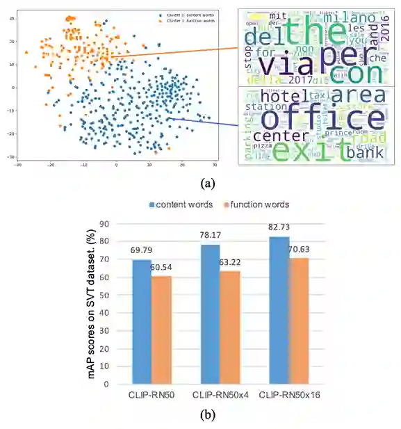 图4 视觉语义概念纠缠。(a)高频场景文字语言特征的t-SNE可视化;(b)原生CLIP模型对于实词和虚词的检索精度对比 如图4(a)所示,作者从MLT训练集中选取高频的500个词,提取其CLIP语言特征,并利用K-means进行簇数为2的聚类。通过t-SNE可视化发现,这些词自然地聚集为实词(如“Hotel”)和虚词(如“The”)两类,其中实词具有明确的语义,视觉语义纠缠程度更高。为了进一步说明该现象对场景文字检索任务的影响,图4(b)对比了原生CLIP模型在实词和虚词上的检索精度,发现虚词检索精度明显低于实词检索精度。由此说明,实词和虚词应该采取不同的检索方案,因此FDP在执行检索之前,会通过聚类结果预先区分查询文本是实词还是虚词。