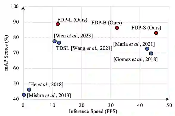 通过与已有方法的性能对比实验(表1)和消融实验(表2),可验证FDP方法的有效性和优越性。在IIIT-STR数据集上,FDP-S与先前最好的方法相比,检索精度提升了4.37%,速度快了4倍。在更有挑战性的SVT和TotalText数据集上,FDP仍然能获得具有竞争力的结果。