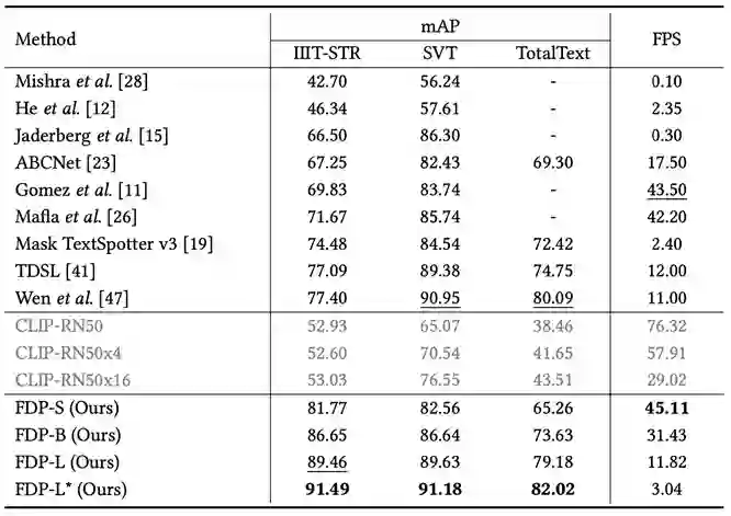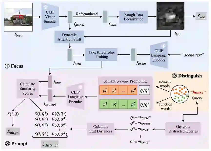 最近的一些工作[5, 6]表明,CLIP模型通过在大量图像-文本数据上预训练,已经具备了一定的OCR能力。受此启发,本文提出一种新视角:是否可以利用CLIP的内在潜能实现准确、高效且灵活的场景文字检索。对此,论文设计提出了一个无需感知的场景文字检索模型FDP (Focus, Distinguish, and Prompt),其中“Focus”步骤挖掘了CLIP中隐含的场景文字有关知识,“Distinguish”和“Prompt”步骤进一步克服了视觉语义纠缠带来的负面影响。在三个公开数据集上的实验结果证明了所提出模块的有效性,并表明FDP在检索精度和速度之间取得了更好的平衡。此外,FDP可以很容易地推广到词组级别或属性感知场景下的文字检索,更适用于实际需求。