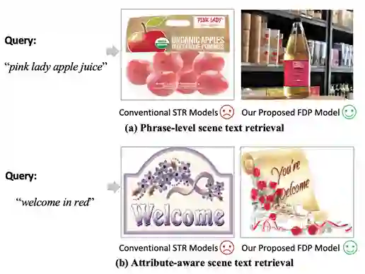场景文字检索旨在从图片库中搜索包含查询文本的所有图像。目前大多数方法借助OCR框架,存在两方面缺陷:1)难以达到检索精度与速度的良好均衡。如图1所示,以TDSL[1]和Wen et al.[2]为代表的检索方法需要引入显式的文字检测或识别过程,在检索速度上呈现不足。相对而言,Gomez et al.[3]利用一个简洁的Single-shot CNN框架能够达到较快的检索速度,但其是以精度的下降为代价的。2)无法处理不同形式的查询文本。如图2所示,现实生活中人们想要检索的查询文本往往是多样化的。但是,现有方法采用局部检索机制(将单词视为查询单元),不能灵活地泛化到词组级别或属性感知等更广泛的检索场景。