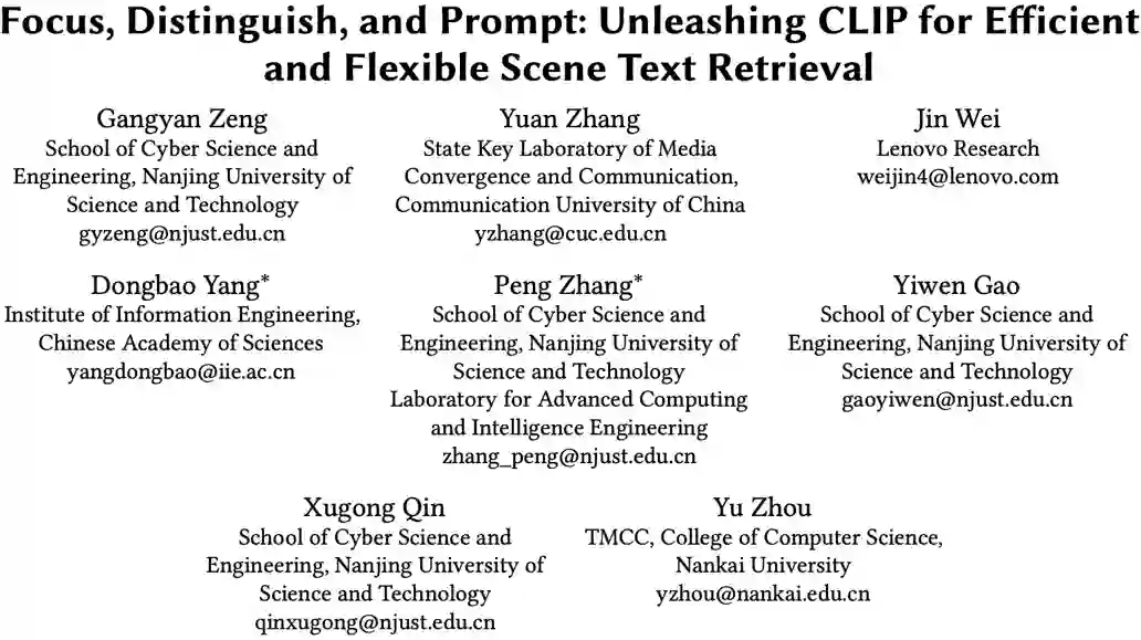 [1] Hao Wang, Xiang Bai, Mingkun Yang, Shenggao Zhu, Jing Wang, and Wenyu Liu. 2021. Scene text retrieval via joint text detection and similarity learning. In CVPR. 4558–4567.[2] Lilong Wen, Yingrong Wang, Dongxiang Zhang, and Gang Chen. 2023. Visual matching is enough for scene text retrieval. In WSDM. 447–455.[3] Lluís Gómez, Andrés Mafla, Marçal Rusinol, and Dimosthenis Karatzas. 2018. Single shot scene text retrieval. In ECCV. 700–715.[4] Kaiyang Zhou, Jingkang Yang, Chen Change Loy, and Ziwei Liu. 2022. Learning to prompt for vision-language models. IJCV 130, 9 (2022), 2337–2348.[5] Yiqi Lin, Conghui He, Alex Jinpeng Wang, Bin Wang, Weijia Li, and Mike Zheng Shou. 2023. Parrot captions teach clip to spot text. arXiv preprint arXiv:2312.14232.[6] Cheng Shi and Sibei Yang. 2023. Logoprompt: Synthetic text images can be good visual prompts for vision-language models. In ICCV. 2932–2941.