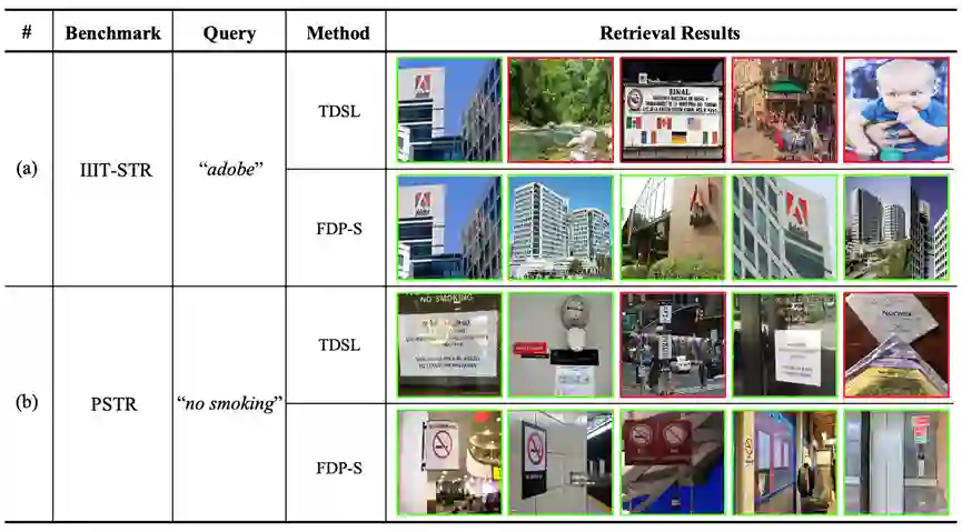 为了验证FDP在处理不同形式查询文本上的优势,作者构建了一个词组级别的场景文字检索数据集PSTR。如表3和图5结果所示,FDP在该数据集上明显优于传统的基于局部检索的方法。图6的定性结果进一步说明FDP能够感知场景文字的颜色、字体和位置等属性信息,具有很好的泛化性。
