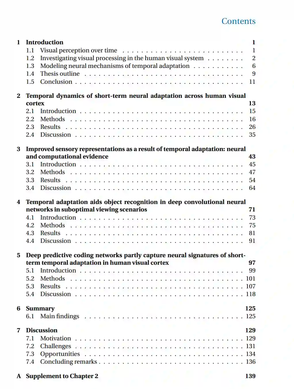 我们所处的世界本质上是动态的,而人类感知的基础在于适应这种持续变化的能力。**时域适应(Temporal Adaptation)被认为是支持这一能力的核心机制之一,它指神经元响应根据输入视觉信号的时间结构所进行的调整。尽管时域适应已得到广泛研究,但关于其如何塑造神经响应并影响感知的关键问题仍有待解决。 在本论文中,我们结合神经与行为测量方法,考察了时域适应如何塑造跨皮层区域动态视觉输入的表征,以及这些自适应过程如何影响人类在退化环境中识别目标的能力。此外,我们利用计算模型(Computational models)识别了时域适应背后的潜在机制,从而深入揭示了神经环路如何随时间实现自适应处理。 研究结果表明,时域适应以区域依赖(Area-dependent)和刺激依赖(Stimulus-dependent)的方式塑造了整个视觉层级结构的神经响应,这暗示了时域适应针对不同视觉区域的功能特化进行了调优。在感知层面,我们证明了时域适应增强了在视觉噪声等挑战性条件下的物体识别能力,凸显了其在输入退化时稳定感知的关键作用。此外,通过计算建模,我们揭示了不同时域适应机制之间的功能差异,表明这种适应源于自下而上(Bottom-up)与自上而下(Top-down)**过程之间的相互作用,且涉及单个神经元及更广泛的神经环路。 总体而言,本研究深化了我们对视觉系统如何利用环境中的时间结构,从而为动态感官输入构建稳定且高效表征的理解。