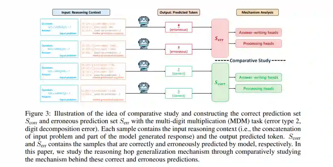 思维链(Chain-of-thought, CoT)推理已成为大语言模型(LLMs)解决复杂问题的标准范式。然而,近期研究表明,在推理步数泛化(Reasoning hop generalization)场景下——即底层算法保持不变,但所需推理步数超出训练分布时——模型性能会出现剧烈下降。导致这一失效的内部机制尚不明确。 本研究对多领域的任务进行了系统性实验,发现错误并非均匀分布,而是集中在少数关键错误类型的 Token 位置上。进一步观察显示,这些 Token 级别的错误预测源于内部竞争机制(Internal competition mechanisms):某些特定的注意力头,即错误处理头(Erroneous processing heads, ep heads),通过放大错误的推理轨迹并抑制正确的轨迹,打破了表征的平衡。值得注意的是,在推理阶段移除单个 ep head 往往就能恢复正确的预测。