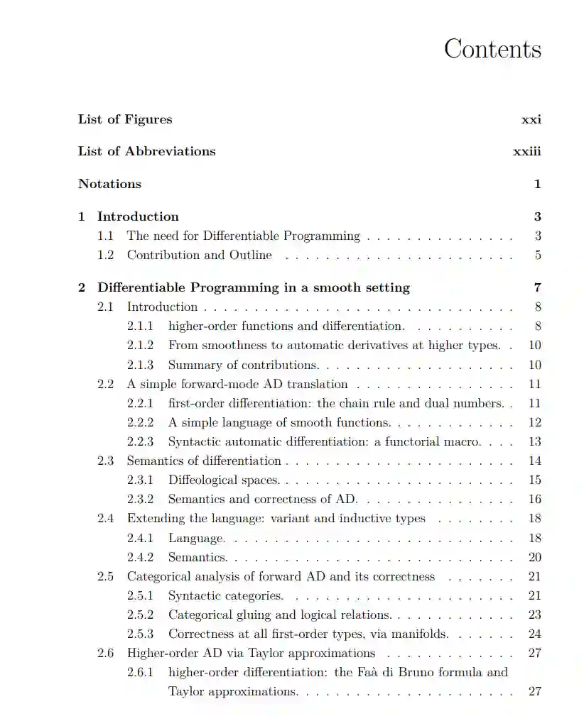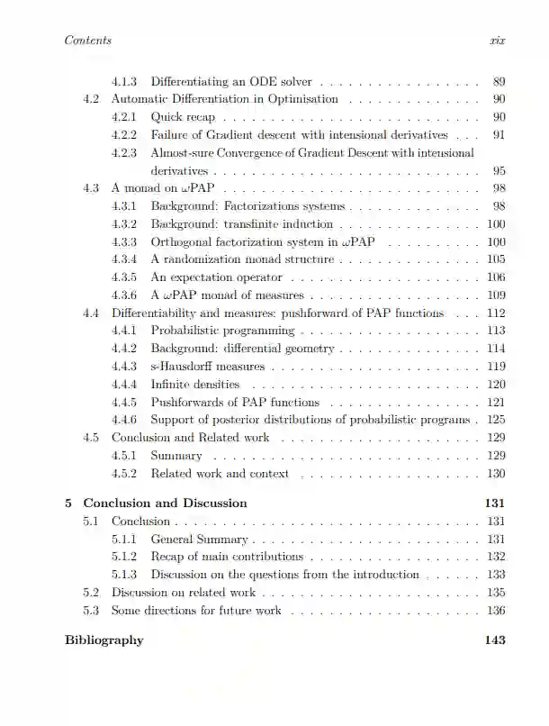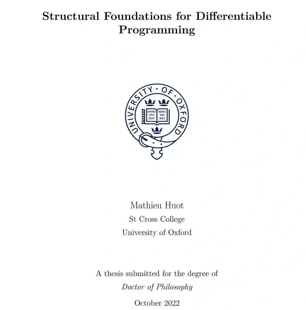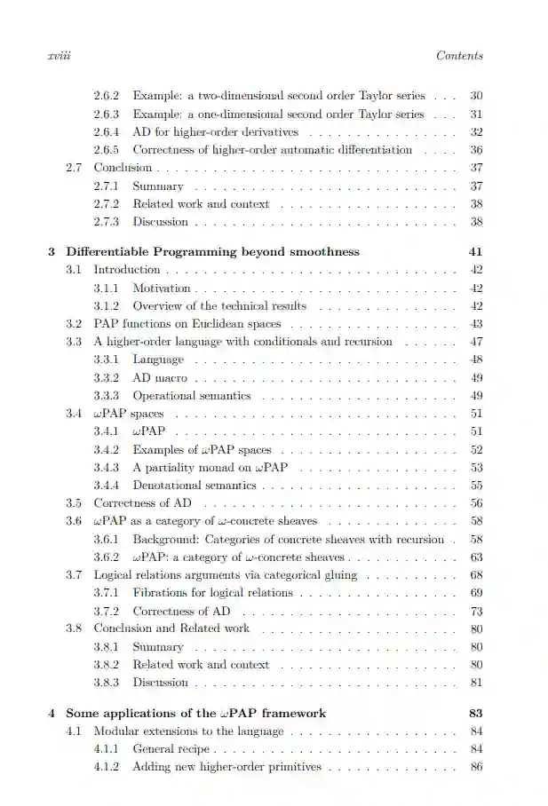 总的来说,这些贡献为我们提供了更深入的对可微分编程的理解。它们为研究现实复杂程序的类似可微分性的属性提供了一个基础设置,超越了像可微分性或凸性这样的常规设置。它们提供了证明这些程序的某些属性,并将自动微分模块化扩展到带有新类型和原语的更丰富的背景的一般方法。