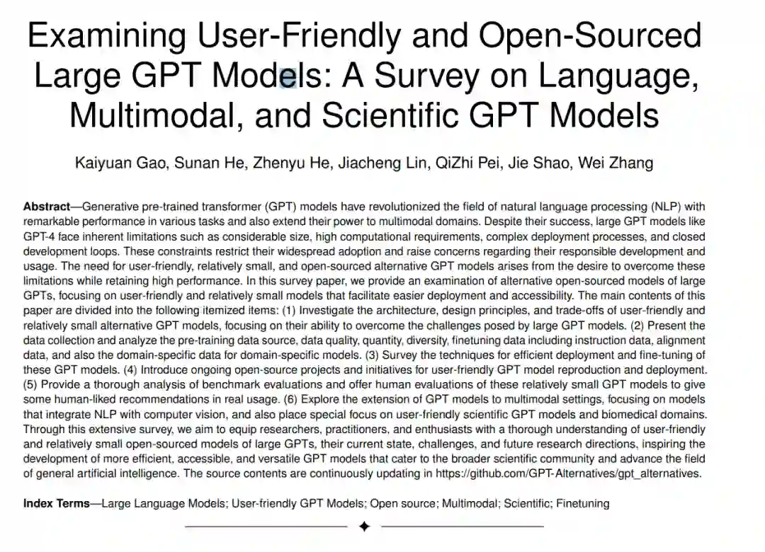 来自华中科技大学最新《研究用户友好和开源的大型GPT模型:关于语言、多模态和科学GPT模型的调查》,值得关注!