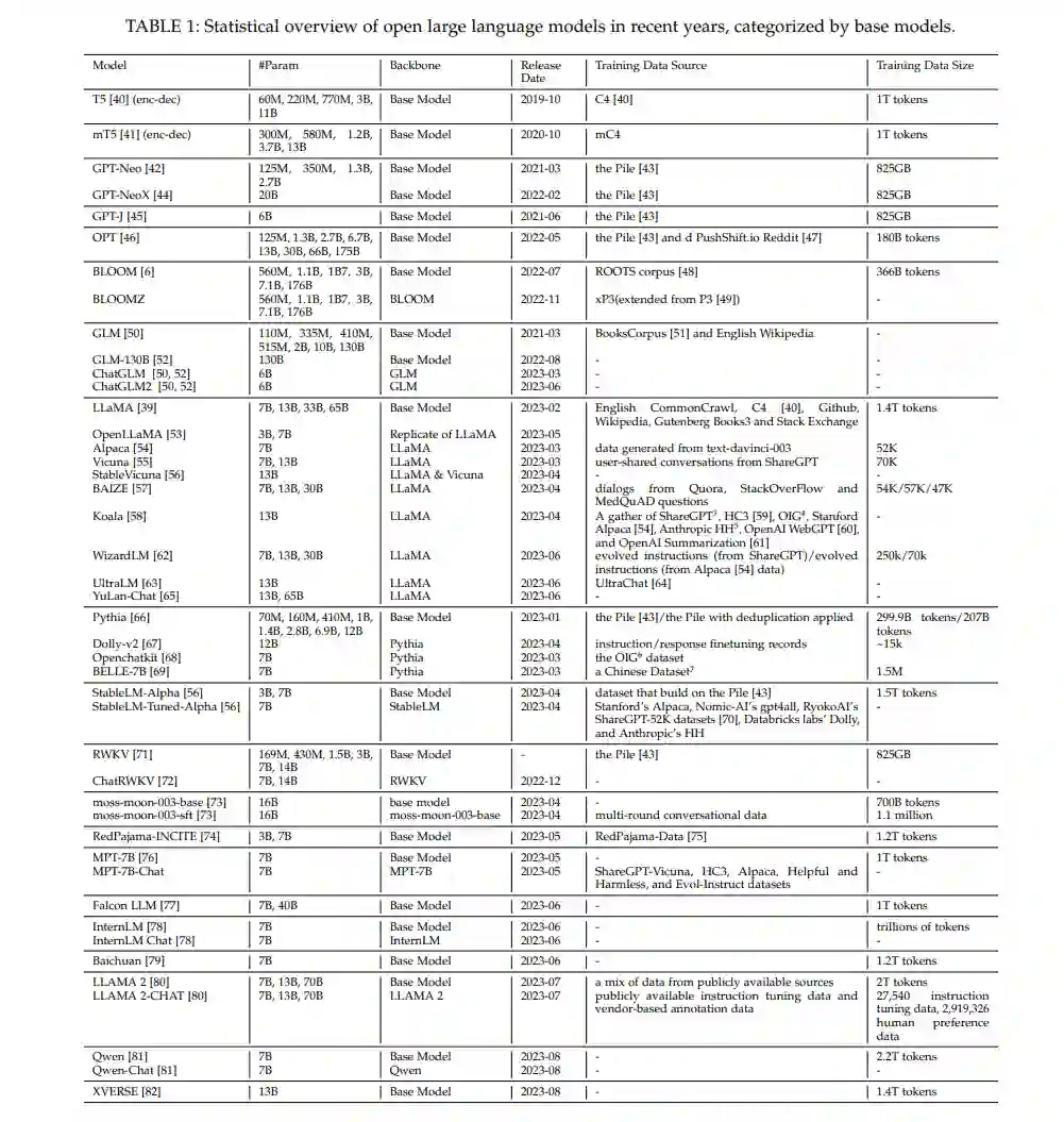 Bloom[6]是一个开放存取的多语言语言模型。它是一个仅使用下一个标记预测目标训练的解码器模型。发布的模型检查点包括560M、1B1、1B7、3B、7B1和176B。BloomZ是基于Bloom的多任务提示微调模型。 GLM[50, 52]是一个预训练的编码器-解码器模型,具有自回归空白填充目标。发布的预训练模型检查点包括110M、335M、410M、515M、2B、10B和130B。ChatGLM-6B和ChatGLM2-6B是基于GLM进行微调的两个开源的中英文双语聊天模型。 LLaMA[39]是一个与GPT-3相似的开源自回归语言模型,进行了适度的架构修改。发布的预训练模型检查点包括7B、13B、33B和65B。由于LLaMA是第一个被广泛认可的性能满意(与GPT-3相当)的开源大型语言模型,因此我们认为LLaMA是在大型语言模型领域开放源码的里程碑。