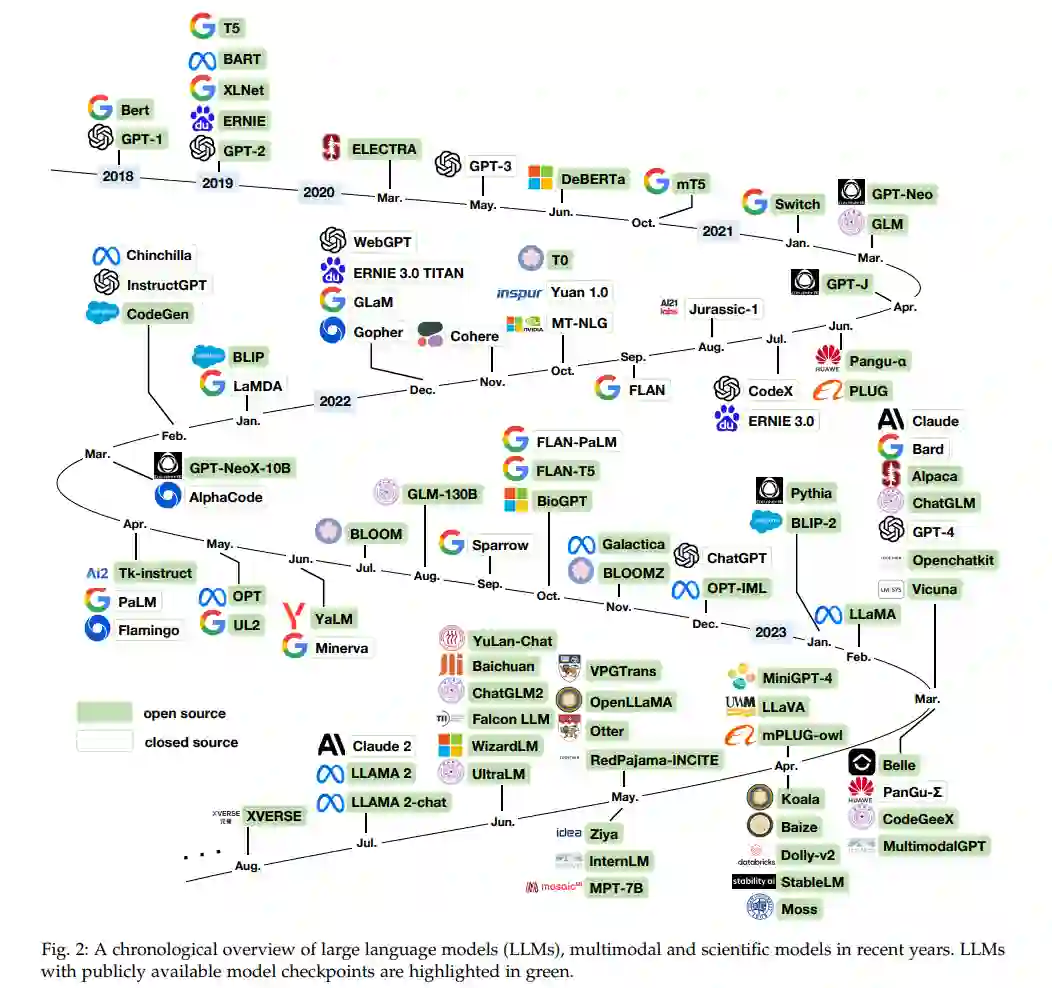 自Transformer[32]模型出现以来,自然语言处理领域发生了重大变革。Transformer模型不仅在性能方面优越(例如,用于机器翻译[32]),而且比RNN[33]模型如LSTM[34]和GRU[35]更易于并行化。GPT-1[36]和Bert[37]是最早尝试利用Transformer模型进行无监督预训练的尝试。通过在大量无标签数据上预训练并在下游数据上微调,它们成为了NLP排行榜上的最先进模型。Bert和GPT-1的不同预训练目标,即遮蔽语言建模和下一个令牌预测,促使了他们的专长。当通过微调比较类似的模型大小时,人们观察到BERT在语言理解任务上的表现优于GPT,而GPT更适合语言生成任务。从GPT-1[36]和GPT-2[38]到GPT-3[2]的GPT模型的演变,观察到了自回归语言模型的两个突出特征:(1)通过增加模型大小和预训练数据大小,可以提高性能。(2)GPT-3通过执行上下文学习和提示,展现出了非凡的少样本和零样本性能。自GPT-3成功以来,已经开发出越来越多的大型语言模型。此后,大型语言模型的发展中的一个里程碑是ChatGPT1的出现,这是一个经过强化学习人类反馈(RLHF)微调的会话模型,并建立在GPT-3.5的基础上,这是GPT-3的升级版本。通过人类偏好的对齐,ChatGPT展现出了出色的会话熟练度,并迅速在公众中得到了认可。继ChatGPT的卓越成就之后,社区最近见证了GPT-4[3]的发布。GPT-4展示了改进的会话熟练度、增强的上下文理解能力和更准确、连贯的回应。通过采用前沿技术并基于ChatGPT和GPT-3.5的成功,GPT-4在多个领域(例如,多模式)取得了重大进展,这标志着大型语言模型演变的另一里程碑,展示了在不久的将来实现更多突破性创新和应用的潜力。在这个过程中,整个AI社区为开发类似GPT的大型语言模型付出了巨大的努力,既有大公司(例如Bard2)旨在构建更强大的模型,也有创建开源替代品(例如LLaMA[39])以促进基础模型的发展。近年来,这些大型语言模型(LLMs)的概述历史如图2所示。