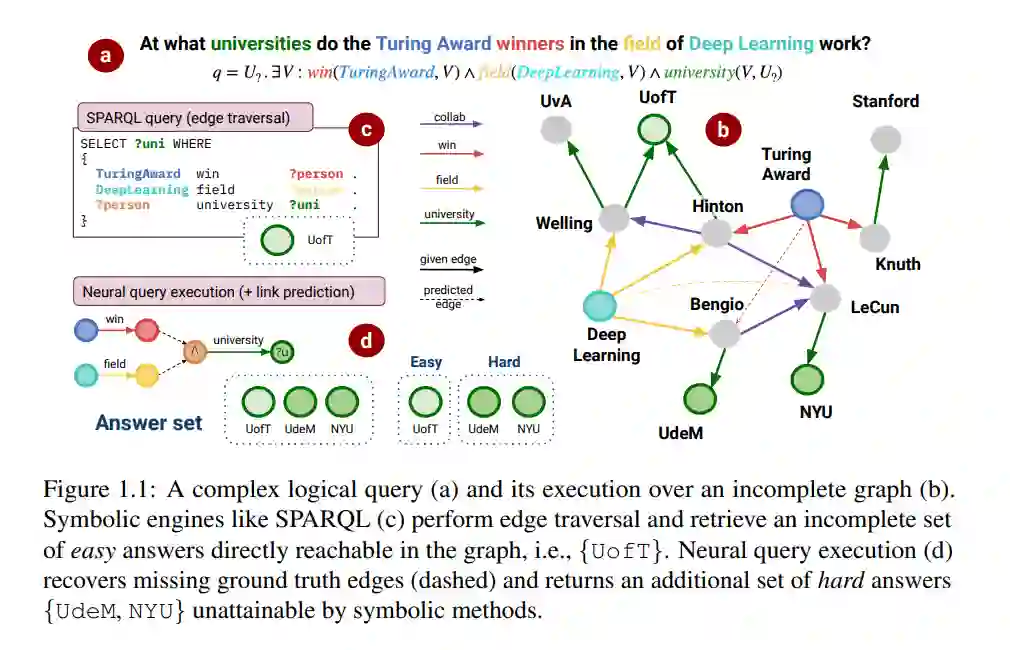 另一方面,图机器学习的最新进展使得在潜在空间中对大型图进行表达式推理成为可能,而不会面临可判定性瓶颈。Hamilton等人(2018)关于图查询嵌入(GQE)的开创性工作为在不完整的知识图谱上回答复杂的、类似数据库的逻辑查询奠定了基础。在这里,通过对实体、关系和逻辑运算符进行可学习的向量表示和神经网络的参数化,可以在查询执行过程中推断出缺失的链接。对于(图1.1)中的不完整知识图,给定一个复杂查询:“深度学习领域的图灵奖得主在哪些大学工作?”,传统的符号图数据库(如SPARQL或Cypher)只会返回一个答案(UofT),可以通过边遍历到达。相比之下,神经查询嵌入在嵌入空间中对图和查询进行参数化。神经查询执行类似于在嵌入空间中遍历图和执行逻辑运算符,这可以推断出缺失的链接,并用两个更相关的答案UdeM和NYU丰富答案集,这两个答案是符号数据库无法获得的。