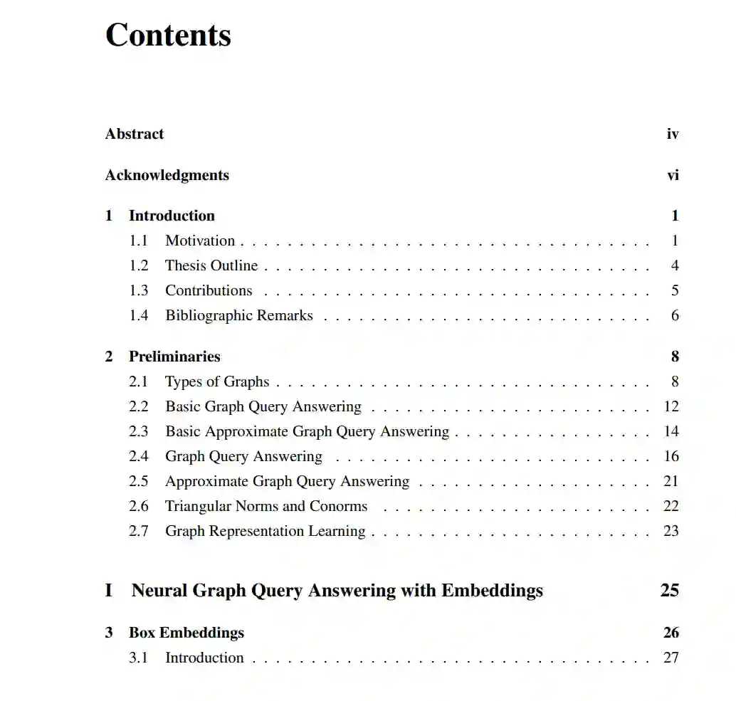 部分0:预备知识。我们首先在第2章介绍背景知识,并对图、查询、模糊逻辑和表示学习进行必要的定义。 部分I:知识图谱上的神经图查询应答。我们首先介绍两种受几何属性启发的神经图查询应答算法。这两种算法提出了与符号对应物保持良好一致的神经查询执行方法,同时也能够发现缺失的答案。在第3章,我们介绍了Query2box模型,该模型将查询嵌入为一个超矩形。Query2box设计了一个神经连接运算符,并使用析取范式处理连接。在第4章,我们提出了BetaE模型,这是第一个使用基于Beta分布的嵌入忠实处理否定操作的神经图查询应答算法。