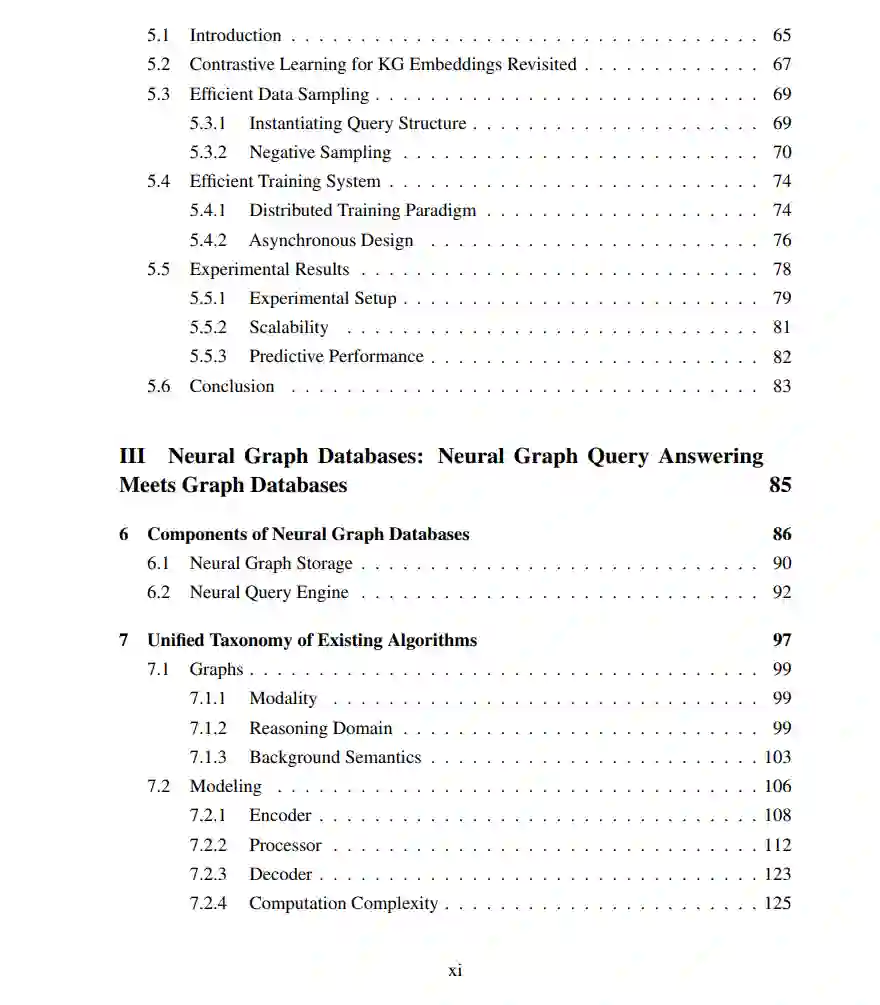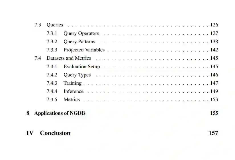 部分III:神经图数据库:神经图查询应答遇到图数据库。最后,我们进一步提出了一个新颖的框架——神经图数据库(NGDB),其中神经图查询应答是核心任务,并通过神经查询嵌入方法来处理。在第6章,我们介绍了NGDB的组成部分:神经图存储和神经查询引擎,它们分别对应于常规图数据库中的两个对应部分的神经版本。在第7章,我们制定了一个分类现有工作的分类法,主要围绕三个轴:图(底层图及其模式背后的逻辑形式主义);建模(用什么神经方法回答查询);查询(可以回答哪些查询)。在第8章,我们列出了神经图查询应答算法的应用。