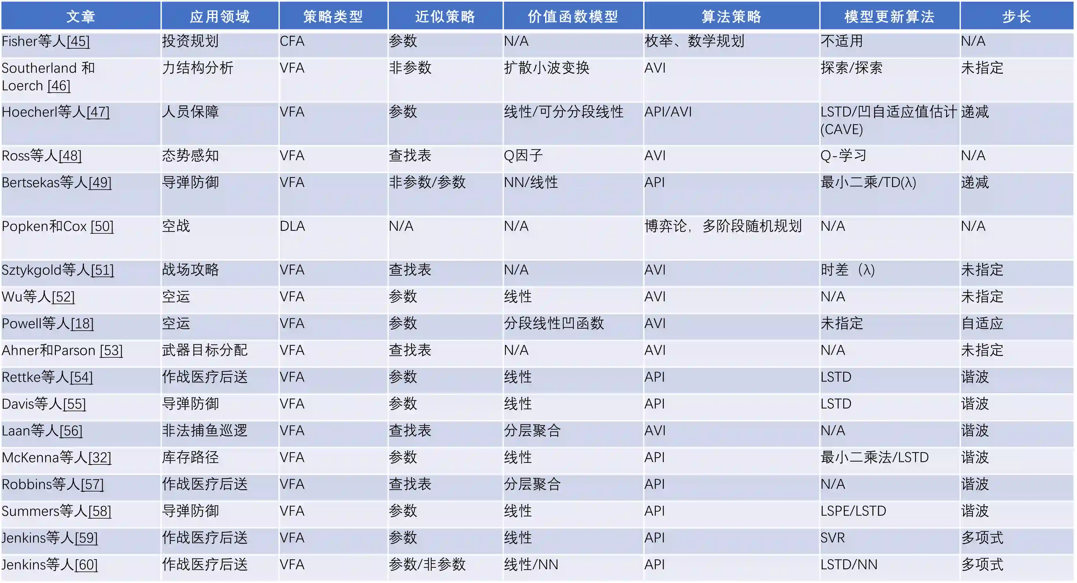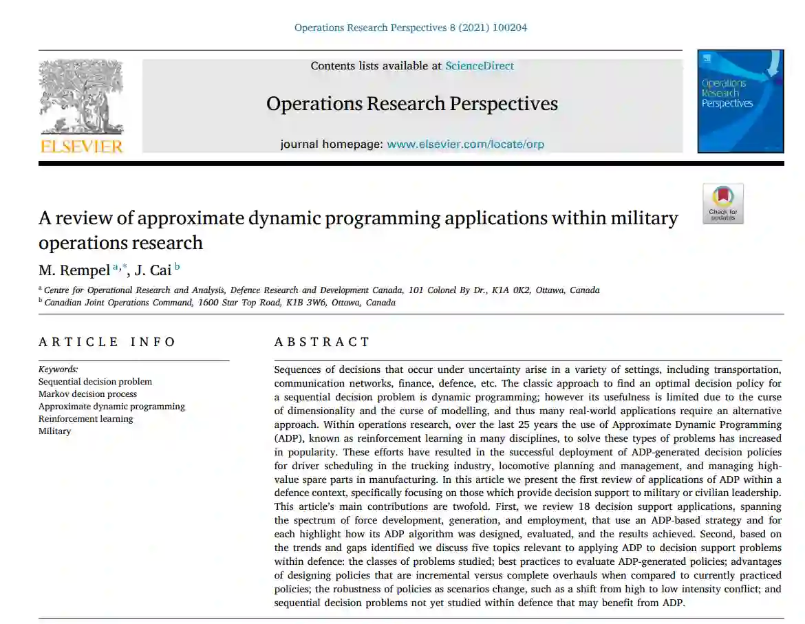 在这篇文章中,我们首次回顾了ADP在国防背景下的应用。特别是,我们专注于军事运筹学领域的同行评议文献;也就是 "应用定量分析技术为军事[或民事]决策提供信息"[27]。本文的主要贡献有两个方面。首先,我们回顾了18个决策支持应用,这些应用跨越了部队发展、生成和使用的范围,使用了基于ADP的策略,并为每个应用强调了其ADP算法是如何设计、评估和取得的结果。其次,基于所发现的趋势和差距,我们讨论了与将ADP应用于国防决策支持问题有关的五个主题:所研究的问题类别;评估ADP生成策略的最佳做法;与目前实行的策略相比,设计策略是渐进式的,而不是完全彻底的;随着情景的变化,策略的稳健性,如冲突中从高强度到低强度的转变;我们还建议提出国防内部可能受益于ADP生成策略的其他顺序决策问题。