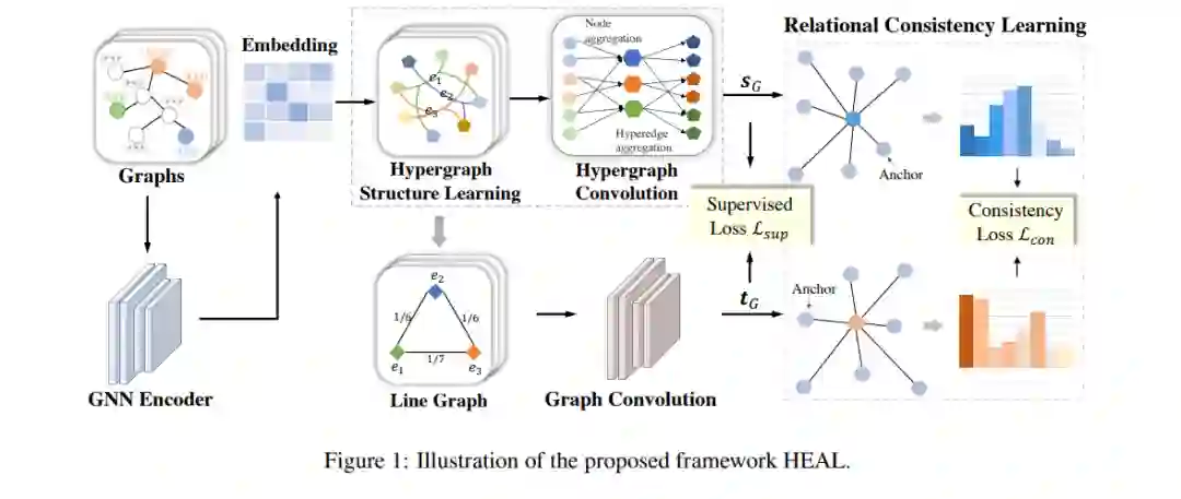 这篇论文研究了半监督图分类,在有限标记图和大量未标记图的情况下,旨在准确预测图的类别。尽管图神经网络(GNNs)具有很强的能力,但它们通常需要大量昂贵的标记图,而大量未标记图未能有效利用。此外,GNNs 在使用消息传递机制编码局部邻域信息方面固有地受到限制,因此缺乏对节点之间高阶依赖关系的建模能力。为了应对这些挑战,我们提出了一个名为 HEAL 的超图增强 DuAL 框架,用于半监督图分类,从超图和线图的角度分别捕获图的语义。具体而言,为了更好地探索节点之间的高阶关系,我们设计了一个超图结构学习方法,以自适应方式学习超过成对关系的复杂节点依赖关系。同时,基于学习到的超图,我们引入了一个线图来捕获超边之间的相互作用,从而更好地挖掘底层语义结构。最后,我们开发了一个关系一致性学习方法,以促进两个分支之间的知识转移,并提供更好的相互指导。对真实世界的图数据集进行的广泛实验验证了所提方法对现有最先进方法的有效性。