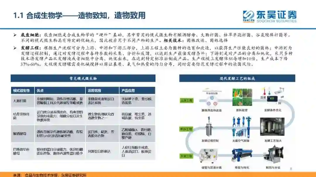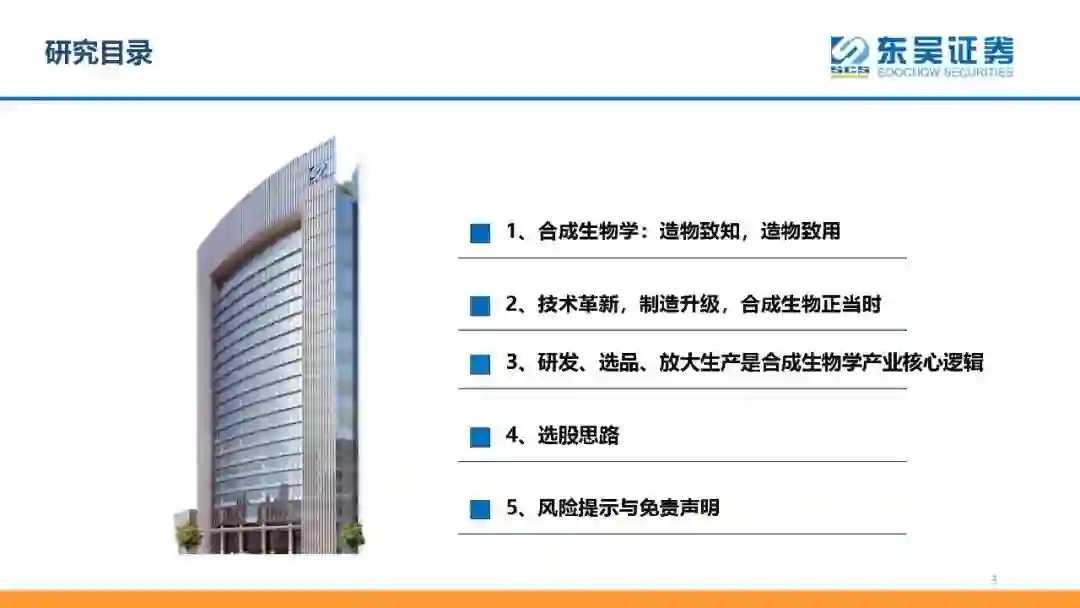 合成生物学造通过对生物体进行有目标地设计、改造乃至重新合成,可以实现以合成生物为工具进行物质加工与合成的新型生产制造方式。合成生物学受益于基因合成、编辑等领域内的长足进步,逐渐发展成了以“设计-构建-测试-学习”(DBTL循环)为核心的研发模式和发酵为主导的放大生产模式。合成生物学由于存在多学科交叉、对技术、成本控制、研发人员要求高,具有强壁垒属性。根据麦肯锡研究,生物制造的产品可以覆盖60%化学制造的产品,未来生物制造的方式有望对未来医药、化工、食品、能源、材料、农业等传统行业带来巨大影响。 温室气体减排、技术进步、成本下降、政策支持、资金流入等多重因素下推动行业高速发展。在全球气温上升,对于新的生产方式迫切需求的情况下,合成生物制造有望成为最优解。合成生物学在底层技术的进步和成本下降下,已取得了长足的进步,同时政府政策对于产业的鼓励不言而喻,在资本推动下合成生物学行业迎来了高速发展的时机。根据麦肯锡的分析,预计在2030-2040年,合成生物学每年带来的经济影响将达到1.8至3.6万亿美元,到2025年,合成生物学与生物制造的经济影响将达到1000亿美元。据CBInsights的预测,2019年全球合成生物学市场规模约为53亿美元,到2024年将扩容至约189亿美元,2019-2024CAGR为28.8%。 从研发、选品、放大生产三个维度看合成生物学公司,拥有集成性的研发平台,所选品种下游市场应用场景丰富、产品间具有协同作用的选品策略,放大生产能力技术完善的公司是行业的标杆。从全球平台型合成生物学龙头公司GinkgoBioworks来看,平台型合成生物学企业在外延并购上积极,以期完善平台能力,形成业务能力闭环。