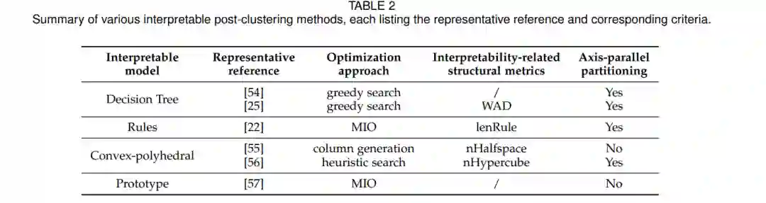 几种代表性的可解释聚类后方法总结在表2中。此外,还可以注意到以下几点:首先,大多数聚类后研究利用决策树作为可解释模型来解释聚类结果。然而,决策树生成的解释存在一些缺点,例如深层决策依赖于浅层决策。此外,可以考虑在选定的维度上使用超平面代替仅沿一个特征进行划分。此外,适合的数据类型可能影响选择哪种可解释模型;例如,描述可能更适合社区分析。因此,涉及其他可解释模型的聚类后方法需要进一步研究。