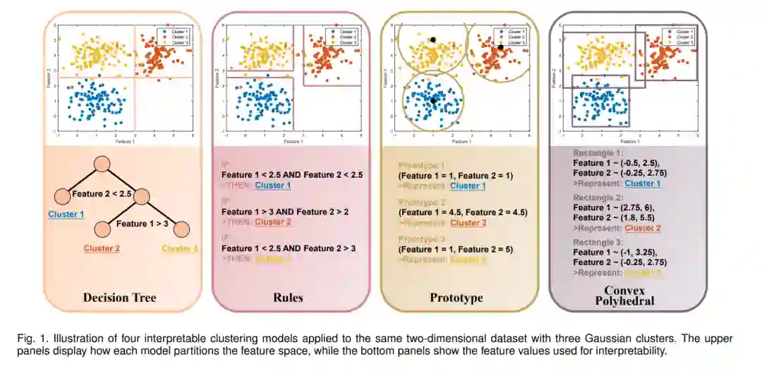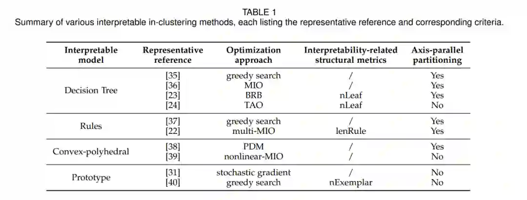 本综述从全面且系统的角度对各种可解释聚类方法进行了探讨,重点介绍了该领域的基础研究和最新进展。这是首个涵盖聚类分析全生命周期的主题,包括聚类前、聚类中和聚类后阶段。在每个阶段,相关的可解释聚类方法文献都进行了回顾。主要目标是明确在聚类背景下可解释性的定义,以及它如何嵌入常用的可解释模型中,如决策树、规则、原型和凸多面体模型。这些模型创建了具有可解释性的聚类,使人类用户能够理解这些元素,并可能使这些聚类结果应用于高风险领域,从而满足透明性和可信度的基本要求。 为提供对该领域未来方向的有价值见解,我们根据不同方面对各种可解释聚类方法进行了分类,并进一步总结了关键技术标准供读者参考,例如:(1) 优化方法,说明来自不同领域的作者如何将可解释性挑战形式化,并使用哪些方法解决这些优化问题;(2) 与可解释性相关的结构度量,这些度量可能被用于评估新方法的可解释性质量,类似于使用准确性评估聚类质量。文献仍然缺乏对更多样化的结构度量的关注。我们相信,研究这些不同可解释聚类方法的研究人员可以互补和增强彼此的工作。此外,不同聚类阶段的方法可以结合使用,因为仅依赖单一阶段的可解释聚类方法可能不足以应对复杂且具有挑战性的应用场景。尤其是在明显的可解释特征不存在的情况下,构建可解释的聚类算法变得困难。此外,针对复杂数据(如离散序列 [32]、网络(图) [70] 以及多视角和多模态数据 [71])的可解释聚类方法的研究仍然有限。