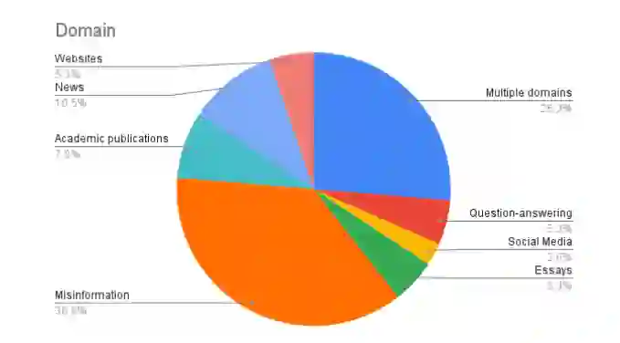 如上所述,另一个重要因素是数据集的领域。图 1.3 显示了数据集中的不同领域。错误信息是最常见的,这无疑是由于我们将重点放在了错误信息这一感兴趣的领域。我们还注意到,在这个大类别中,还有多个子类别(如假新闻、社交媒体错误信息等)。相当大比例的数据集也包含多个域(因此也包含子域)。除了这些类别外,我们还观察到新闻、学术写作和论文等领域的受欢迎程度。社交媒体虽然从实用的角度来看非常有趣,但却没有得到很好的体现,这可能是由于在短文中检测 AIGT 的困难,或者在创建数据集时模拟真实的社交媒体帖子的困难。