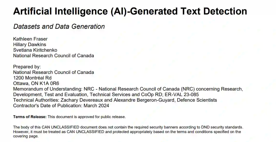 检测人工智能生成的文本(AIGT)主要有三种方法:水印、统计和文体分析以及使用预训练的语言模型(LM)。检测水印需要了解水印提取算法;除此之外,不需要额外的数据。不过,其他两种广泛的检测方法需要数据集,以便学习将 AIGT 与人类撰写的文本区分开来的模式--最好是由我们希望检测的人工智能模型生成的数据集,而且数据集的设置要尽可能接近我们在现实世界中遇到这些文本的方式。以往的研究表明,最有效的检测器是在与测试数据相同的领域(新闻文章、社交媒体帖子、学术论文等)、语言(英语、中文、法语等)和模型设置(解码算法、提示、输出长度等)的数据上训练出来的。同时,研究还表明,为了获得最大的通用性和鲁棒性,必须在各种数据上训练检测器,使其不局限于(或者用机器学习的术语来说,是overft)一个非常狭窄的数据样本范围。因此,对于任何给定的应用,选择适当的数据来训练检测器以及测试检测器的准确性都是非常重要的。