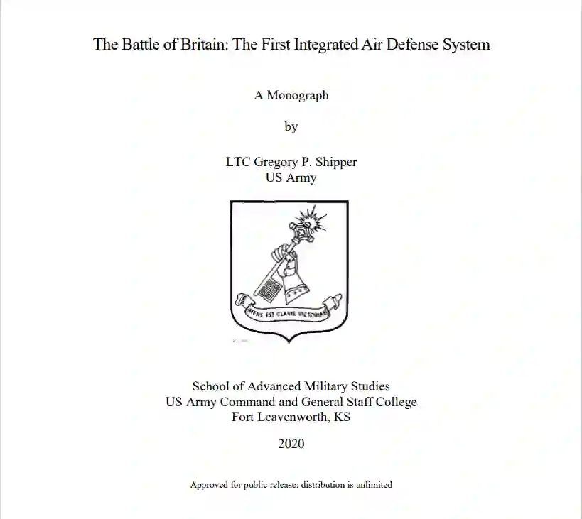 不列颠战役是唯一一场完全由空中力量进行的战役,并取得了胜利。本专著所探讨的研究问题是:英国的综合防空系统是如何阻止德国空军为入侵英国而设定的要求的?英国人之所以取得胜利,是因为他们的分层防御计划给没有护卫的德国轰炸机带来了多个同时存在的问题,使他们无法专注于他们的指定任务。雷达的秘密使用导致英国皇家空军有能力预先确定其时间地点,并选择让英国战斗机中队与轰炸机交战。英国人比德国人更迅速地了解作战环境的变化的能力,导致他们有能力在德国的决策周期内行动。约翰-博伊德上校的OODA循环概念的设计是为了帮助更好地理解不断变化的环境,比敌人更快地提出多个问题让他们解决,阻止他们完成任务。对今天的作战环境来说,重要的是技术如何帮助以更快的速度处理信息,加快了解战场的过程,并比敌人更迅速地运作。