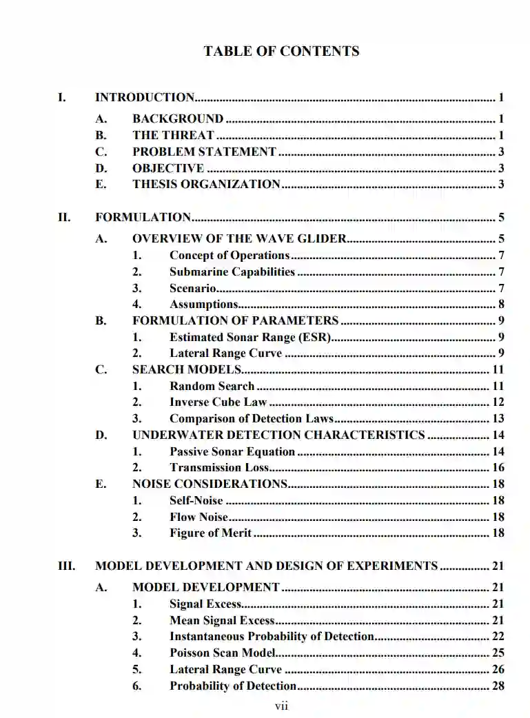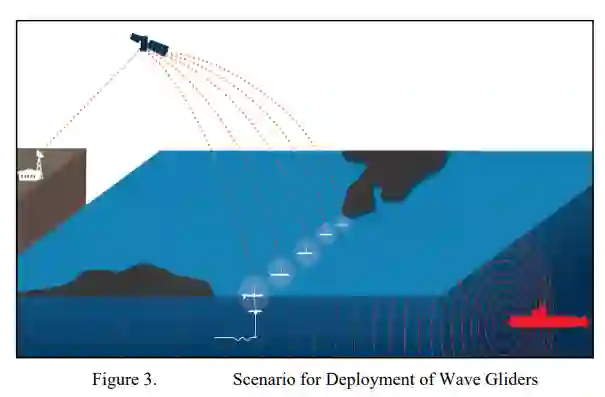 在购置海军平台的资本有限的限制下,需要应对海上挑战。像波浪滑翔机这样的无人平台可能有助于解决这个问题。波浪滑翔机是一种无人水下航行器,它可以配备一个被动阵列,并可以在感兴趣的区域(AOI)保持长时间的部署。它们能够提供分层防御,防止对手在不被发现的情况下穿越该区域,从而提供低成本、持久性的反潜战(ASW)解决方案。在2016年由英国皇家海军领导的 "无人勇士 "演习中,展示了反潜波浪滑翔机成功追踪一艘载人潜艇的能力。然而,如何部署一定数量的波浪滑翔机来探测一艘过境的对手潜艇的问题仍然相对没有被探索。本论文旨在开发一个模型,以确定部署的波浪滑翔机的探测能力,该模型考虑了与探测水下接触有关的变量,在具有声学挑战性的水下环境中使用被动声纳,并在部署无人资产方面受到限制。该模型规定了实现特定探测概率所需的波浪滑翔机的最佳数量,并为其在AOI中的位置提供了参考,以尽量减少对手潜艇穿越该区域而不被发现的概率。