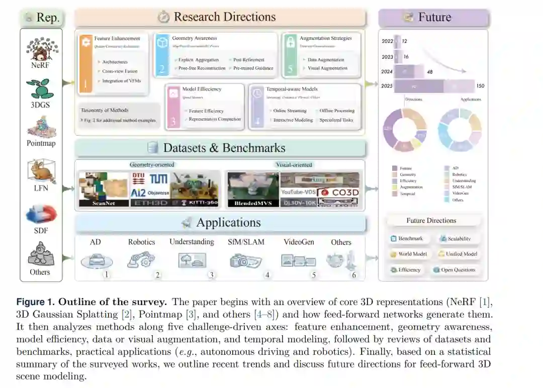 为了给该分类体系提供实证支撑与标准化评估,我们进一步全面审视了相关基准测试(benchmarks)与数据集,并对基于前馈 3D 模型的现实应用进行了详尽的分门别类。最后,我们概述了未来的研究方向,旨在解决可扩展性、评估标准及世界建模(world modeling)等开放性挑战。更多资源可见于我们的 GitHub 仓库及项目主页。 关键词前馈式 3D(Feed-forward 3D)、网格(Mesh)、有符号距离函数(SDF)、占用率(Occupancy)、3D 高斯泼溅(3DGS)、神经辐射场(NeRF)、点图(Pointmaps)、综述