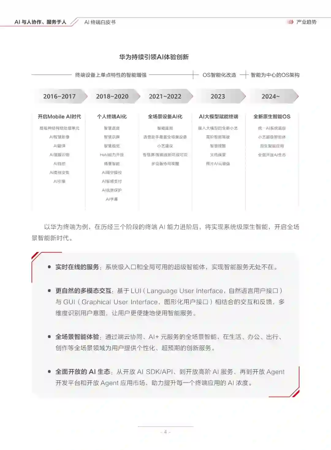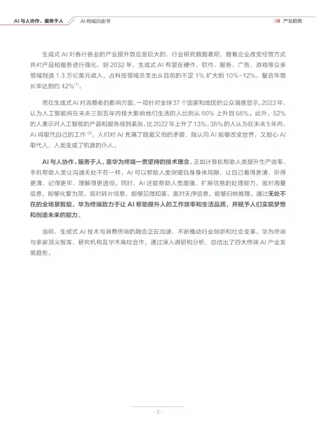 当前,生成式 AI技术与消费终端的融合正在加速,不断推动行业创新和社会变革。华为终端与多家顶尖智库、研究机构及学术高校合作,通过深入调研和分析,总结出了四大终端A1产业发展趋势。 来源:华为&清华大学