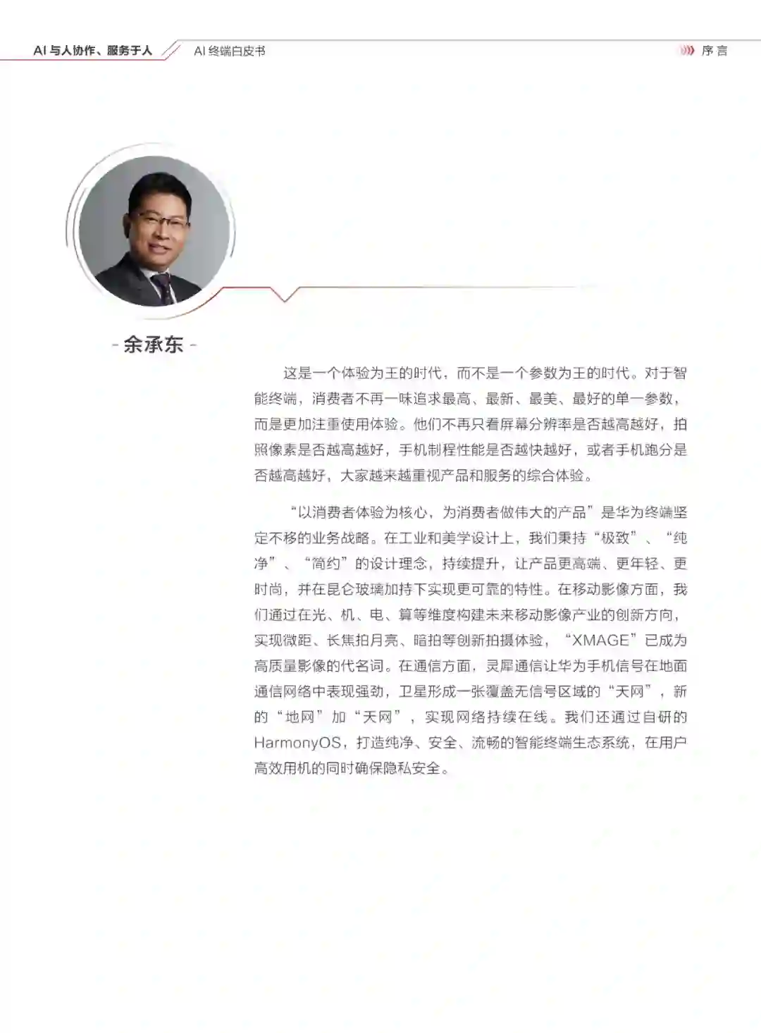 A1与人协作、服务于人,是华为终端一贯坚持的技术理念。正如计算机帮助人类提升生产效率、手机帮助人类让沟通无处不在一样,AI可以帮助人类突破自身身体局限,让自己看得更清、听得更清、记得更牢、理解得更透彻。同时,AI还能帮助人类增强、扩展信息的处理能力,面对海量信息,能够化繁为简,面对碎片信息,能够见微知著,面对无序信息,能够归纳推理。通过无处不在的全场景智能,华为终端致力于让 AI帮助提升人的工作效率和生活品质,并赋予人们实现梦想和创造未来的能力。