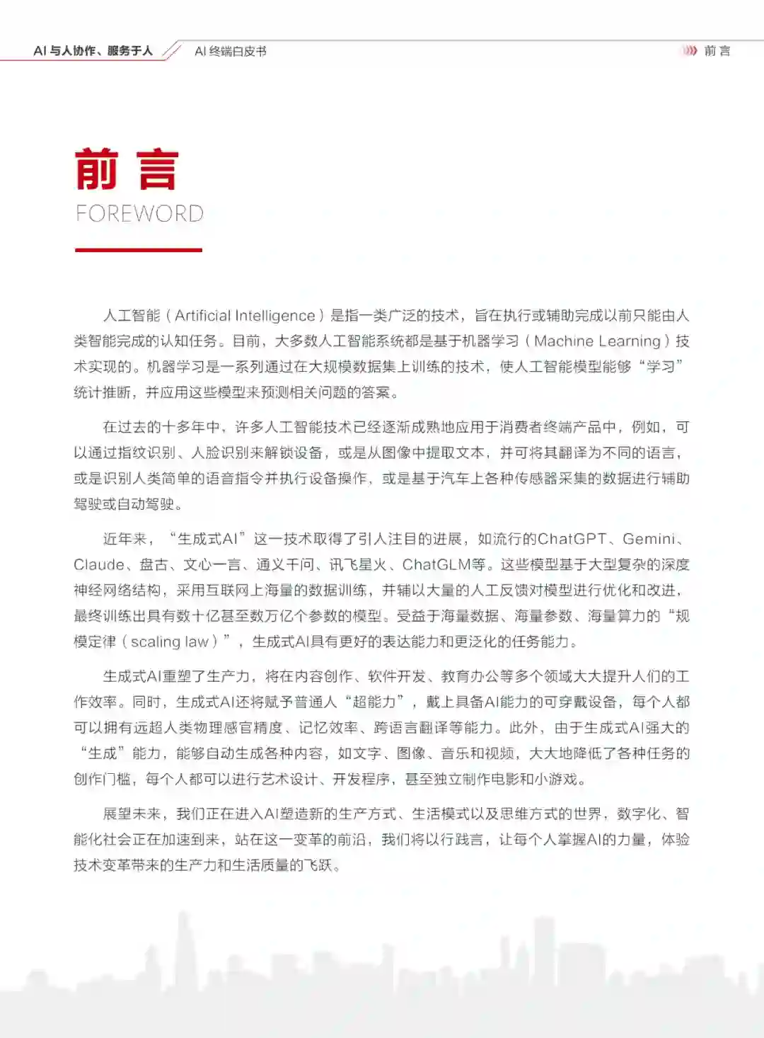 在过去的十多年中,许多人工智能技术已经逐渐成熟地应用于消费者终端产品中,例如,可以通过指纹识别、人脸识别来解锁设备,或是从图像中提取文本,并可将其翻译为不同的语言,或是识别人类简单的语音指令并执行设备操作,或是基于汽车上各种传感器采集的数据进行辅助驾驶或自动驾驶。 近年来,“生成式AI”这一技术取得了引人注目的进展,如流行的ChatGPT、Gemini、Claude、盘古、文心一言、通义千问、讯飞星火、ChatGLM等。这些模型基于大型复杂的深度神经网络结构,采用互联网上海量的数据训练,并辅以大量的人工反馈对模型进行优化和改进,最终训练出具有数十亿甚至数万亿个参数的模型。受益于海量数据、海量参数、海量算力的“规模定律(scaling law)”,生成式AI具有更好的表达能力和更泛化的任务能力。