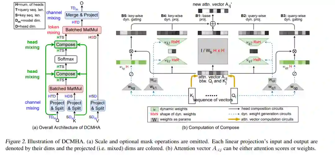 多头注意力机制(Multi-Head Attention, MHA)是Transformer的关键组件之一。在MHA中,各个注意力头独立工作,这会导致一些问题,如注意力分数矩阵的低秩瓶颈和头部冗余。我们提出了动态可组合多头注意力机制(Dynamically Composable Multi-Head Attention, DCMHA),这是一种参数和计算高效的注意力架构,旨在解决MHA的缺点并通过动态组合注意力头来增强模型的表达能力。