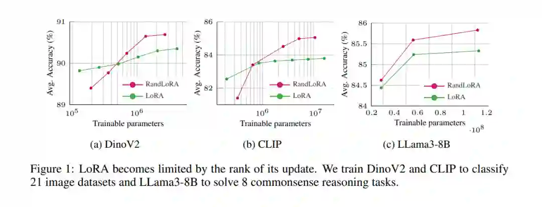 低秩适应(LoRA)及其变体在减少大型Transformer网络的可训练参数数量和内存需求方面取得了显著成果,同时保持了微调性能。然而,权重更新的低秩性质本质上限制了微调模型的表示能力,可能会影响复杂任务的表现。这引出了一个关键问题:当观察到LoRA与标准微调之间的性能差距时,这个差距是由于可训练参数数量减少,还是由于秩缺陷?本文旨在通过引入RandLoRA这一参数高效的方法来回答这个问题,该方法使用低秩、非可训练的随机矩阵的线性组合进行全秩更新。我们的方案通过将优化限制在作用于固定随机矩阵的对角缩放矩阵上,从而限制了可训练参数的数量。这使得我们能够在保持训练过程中的参数和内存效率的同时,有效克服低秩限制。通过在视觉、语言和视觉-语言基准上进行广泛的实验,我们系统地评估了LoRA和现有随机基方法的局限性。我们的研究发现,单独应用于视觉和语言任务时,全秩更新均表现出优势;尤其是在视觉-语言任务中,RandLoRA显著缩小——甚至有时消除——标准微调与LoRA之间的性能差距,证明了其有效性。