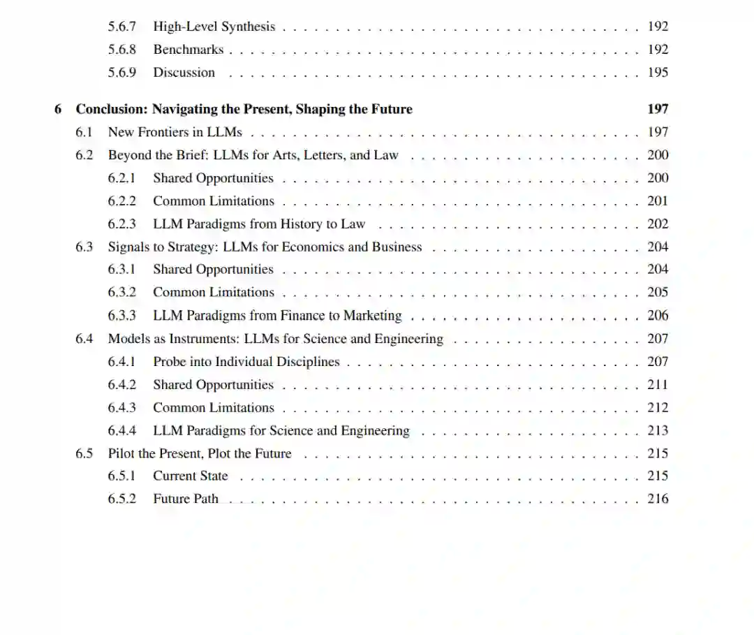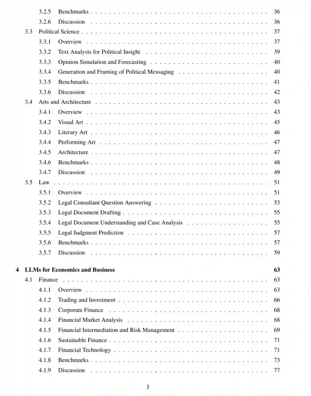 当今,前沿的人工智能(AI)技术正在不断重塑我们对世界的认知。例如,基于生成式预训练 Transformer(GPT)架构的基础语言模型 ChatGPT [1],已经展现出在广泛主题上生成类人对话的能力,使其成为增长最快的应用程序(即在上线后的前两个月内用户数突破 1 亿)[2]。尽管其在鲁棒性与真实性方面仍存在局限,但凭借在多种语言相关任务(如开放域问答、翻译和文档摘要)上的卓越表现,ChatGPT 展示出在客户服务、个人助理以及医学诊断等多样化场景中的潜在应用价值。除了自然语言处理(NLP)领域的 ChatGPT 等模型外,计算机视觉(CV)中的预训练基础模型(如 Florence/Florence-2 [3] 与 Qwen2.5-VL)也在目标检测、图像分割、视频推理等多项视觉任务上取得了最先进水平,使其在面部识别、医学图像分析以及自动驾驶等应用中展现出显著价值。这种跨模态的融合进一步凸显了大语言模型(LLMs)的关键作用——它们不仅为表征学习和推理提供了统一框架,也成为嵌入其他模态的核心支柱,从而在 AI 驱动的科研与应用生态系统中居于中心地位。 受这些最新进展的启发,本文将综述前沿的大语言模型及其在多个学术学科中的应用整合,涵盖:(1) 人文、文学与法律(历史、哲学、政治学、艺术与建筑、法律),(2) 经济与商业(金融、经济学、会计、市场营销),以及 (3) 科学与工程(数学、物理与机械工程、化学与化学工程、生命科学与生物工程、地球科学与土木工程、计算机科学与电子工程)。作为人文探索与技术发展的交汇点,本文旨在探讨 LLMs 如何重塑各领域的研究工作流与专业实践,并进一步梳理其所面临的主要局限、未解挑战以及在生成式 AI 时代的未来发展方向。通过综合跨学科的应用并提炼关键洞见,本综述期望为希望利用 LLMs 推动现实应用研究与实践的学者与从业者提供指导。 基于近期突破,本文在第 2 章中首先介绍 LLM 的基本概念与评估方法。我们从精确定义与简要发展历史入手,进而通过概览和重点剖析主流模型家族——包括 GPT 系列、OpenAI 推理模型、Claude 3、Gemini 2、Grok、Llama 3、Qwen 2 和 DeepSeek——来绘制前沿图谱,突出其设计选择与功能特点。随后,我们讨论评估维度:涵盖核心任务类型、代表性基准数据集与常用方法,并给出性能综述,以期为理解模型表现与方法选择提供背景、比较图景与实践指南。 在三个学科群组(人文、文学与法律;经济与商业;科学与工程)中,我们首先通过综述其主要研究任务与传统方法来引入学科背景,强调其关键贡献与重要影响。接着,我们识别可由 AI 尤其是 LLMs 辅助解决的共性研究挑战,并提出一个任务分类体系,将学科研究与 LLMs 相结合:既保持学科相关性,又在算法层面确保一致性,以支持模型开发、基准评测与比较分析。在每个类别中,我们回顾现有的 LLM 驱动的研究与应用,探讨其局限,并展望未来研究方向。最后,我们总结代表性基准与关键讨论。 在第 3 章中,我们调研 LLMs 如何正在改变人文学科与法律领域,从证据到实践展开。在历史学中,我们涵盖叙事生成与分析、定量与科学方法(如历史心理反应的模拟),以及跨学科研究,并结合基准讨论。在哲学中,我们回顾规范与解释性应用(如辩论/对话生成)、分析与逻辑应用(如符号落地诊断),以及跨学科研究。政治学部分,我们考察政策洞察的文本分析、意见模拟与预测、政治信息生成与框架化,并附带基准与反思。艺术与建筑部分,我们综述模型辅助的视觉、文学、表演艺术创作,以及基于 LLM 的建筑设计与分析,并总结评估与经验。最后,在法律部分,我们覆盖法律问答、合同与文书撰写、法律文档理解与案例分析、判决预测,并附以基准与讨论。 在第 4 章中,我们综述 LLMs 在经济与商业中的应用。在金融领域,我们涵盖交易与投资研究、公司金融、市场分析、金融中介与风险管理、可持续金融、金融科技及相关基准。在经济学中,我们涉及行为与实验研究、宏观经济模拟与基于智能体的建模、博弈论与战略互动、经济推理与知识表征,并配套评估。在会计部分,我们审视审计、财务与管理会计、税务,并总结基准。在市场营销部分,我们涵盖消费者洞察与行为分析、内容生成与活动设计、市场情报与趋势分析,同样附带性能基准。 在第 5 章中,我们系统回顾 LLMs 在科学与工程中的应用。数学部分包括定理证明辅助、理论探索与模式识别、数学教育与相关基准。物理与机械工程部分涵盖文档任务、设计构思与参数化制图、仿真支持与建模接口、多模态实验解读、交互式推理,并附以评估与讨论。化学与化学工程部分包括分子结构与反应推理、性质预测、材料优化、实验映射、分子设计、反应数据组织,并比较不同基准。生命科学与生物工程部分涵盖基因组序列分析、临床结构化数据整合、生物医学推理与理解、混合结果预测,并特别关注验证标准。地球科学与土木工程部分包括地理空间与环境数据任务、仿真与物理建模、文档处理、监测与预测性维护、设计与规划,并总结基准。最后,在计算机科学与电子工程部分,我们综述代码生成与调试、大规模代码库分析、硬件描述语言生成、功能验证、高层综合,并附以专用基准与挑战讨论。 在第 6 章中,我们以“把握当下,塑造未来”为题进行总结,综合跨领域证据,概述新兴前沿,归纳人文学科与法律、经济与商业、科学与工程三个领域的