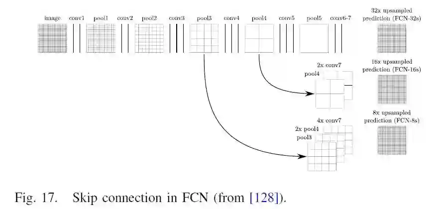 5.1.4. 连接 在 CNNs 中,层与层之间主要有两种连接:跳跃连接和并行连接。 A. 跳跃连接 全卷积网络 (FCN) [128]是采用跳跃连接的代表性网络,由 Long 等人在2015年提出。FCN 将 CNN 中用于分类的全连接层替换为卷积层,实现了端到端的像素级预测,是语义分割领域的里程碑之作。其中的跳跃连接结构可以将来自不同层次的多尺度特征进行有效的结合,包括深层的粗特征以及浅层的细特征,从而提高分割准确率。在FCN的网络结构中,最上层是常见的串联分层网络结构,对最后一个卷积层 conv7得到的特征图进行32倍的上采样,得到预测图,称为 FCN-32s。第二行是将 conv7 的特征图进行2倍上采样后与 pool4 的特征图进行融合,得到16倍上采样的预测结果 FCN-16s。此时网络既能保留大尺度的语义信息,又能保留小尺度的细节信息。最后一行则将来自 pool3 的预测结果与前面二者融合,经过上采样得到 FCN-8s,这进一步提供了细节信息。