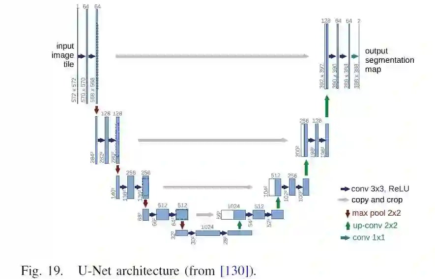 尽管 FCN 中的跳跃连接可以充分利用网络不同层次的特征,但却没有考虑像素与像素之间的关系,也就是多尺度上下文,这在语义分割中是一个非常重要的考量因素。为了解决这一问题,Liu 等人 [129] 向 FCN 中添加全局上下文,提出了 ParseNet。具体来说,使用全局池化提取某一层的全局特征,经过反池化操作后再与原特征图进行组合,一起输入到下一层。ParseNet 上下文模块可以有选择地应用于不同的特征图,在提升性能的同时没有引入太多的计算开销。事实上,空洞卷积和ASPP 都是为了充分利用多尺度上下文特征而提出。 U-Net [130] 也是在 FCN 基础上的修改和扩展,具有更加优雅的“U”型结构。类似地,U-Net 也使用了跳跃连接,不过与 FCN 不同的是,U-Net 在融合不同尺度的特征图时采用的是拼接的方式,即不同通道直接进行叠加,而 FCN 则是对应位置进行求和。U-Net 的结构包括一个收缩路径和扩展路径,也被称为编码器-解码器。收缩路径是 CNN 的标准结构,由重复的卷积和池化层组成。扩展路径通过连续的上采样操作来逐步恢复特征图到原始图像大小。采用跳跃连接将收缩路径中的特征图叠加到扩展路径的对应层中,这样可以将不同尺度的上下文信息补充到上采样特征图中,并且传播到更高分辨率的层。U-Net 起初被应用在医学图像分割中,但其简洁和有效的网络结构使其迅速泛化到各种语义分割任务中,很多变体也接连被提出 [133][134][135]。