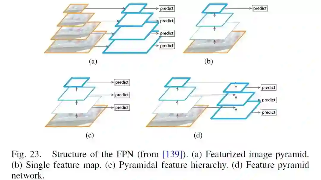 虽然 CNN 的不同层次可以形成天然的多尺度结构,但是浅层特征和深层特征对语义信息的捕捉能力是不同的,因此直接在不同层进行存在很大的局限性。针对这一问题,Lin 等人 [139] 提出了特征金字塔网络 (FPN),通过构建自上而下的路径和跳跃连接来在所有的尺度上提取强语义特征,然后分别进行预测。他们还对不同类型的网络内特征金字塔进行了分析,这与我们对多尺度输出的描述相一致。FPN 巧妙的多尺度特征预测方式使其在目标检测领域有着广泛的应用,许多工作也基于 FPN 展开研究 [150][151][152][153][154]。