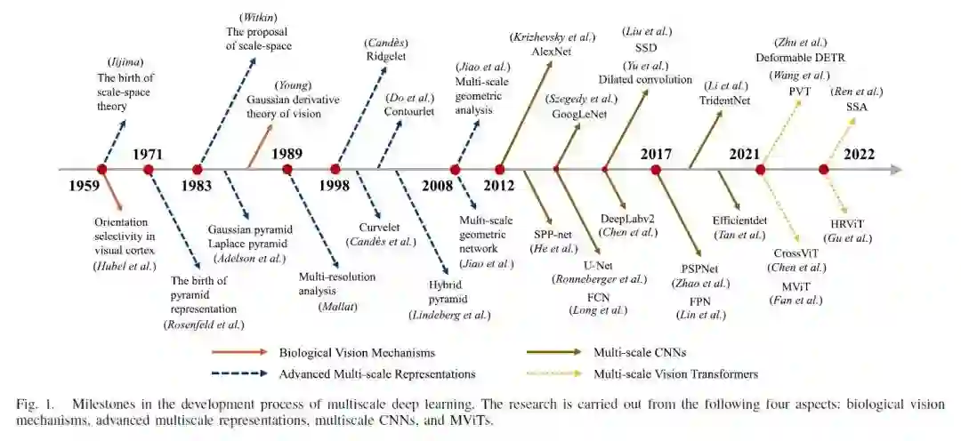 近年来,计算机视觉中的多尺度问题逐渐引起人们的关注。本文聚焦于目标检测与识别任务的多尺度表示,全面介绍了多尺度深度学习的发展历程,构建了一个概括能力强且易于理解的分类体系。首先给出“尺度”的定义,阐述了人类视觉系统中的多尺度机理,进而引出计算机视觉中的多尺度问题。其次,介绍了得到充分发展的多尺度表示方法,包括金字塔表示、尺度空间表示和多尺度几何表示。然后,对多尺度深度学习方法进行分类和讨论。具体来说,将多尺度卷积神经网络(CNNs)抽象到经典的CNN框架中,形成自然的分类。此外,对视觉Transformers(ViTs)中的多尺度建模方法进行总结。对多种方法在不同任务上的性能进行了比较,评估了不同多尺度结构设计的有效性。最后,在深入了解现有方法的基础上,提出了多尺度深度学习中值得探索的一些问题,作为未来可能的研究方向。