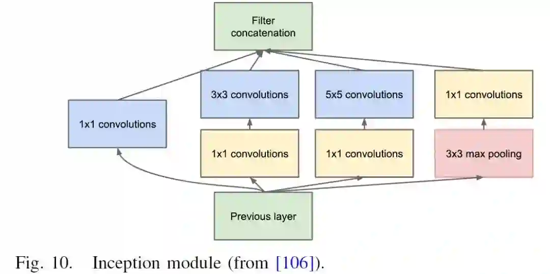 5.1.1. 输入 多尺度输入也就是对输入网络的图像进行多尺度表示,通常采用传统方法中的金字塔表示法。Farabet 等人 [89] 在场景标记任务中对原始输入图像进行拉普拉斯金字塔表示,然后利用卷积网络进行特征提取。该方法充分利用了像素的上下文信息,实现了捕捉纹理、形状的强大表示。同年,Schulz 等人 [90] 对输入图像采用相似的金字塔表示方法,并且在输出中使用了一个成对的类过滤器来对预测图进行平滑。Papandreou 等人 [91] 将输入图像的金字塔表示展开为一个图像 “patchwork”,然后滑动固定大小的窗口,从而实现多位置和多尺度的搜索。 Girshick 等人 [92] 将传统的特征提取方法可变形部件模型 (DPM) 与 CNN 相结合,提出了 DeepPyramid DPM。该模型从输入图像中构建金字塔表示,将其输入到CNN中得到相应的特征金字塔,再将不同尺度的特征送入到 DPM-CNN 模块,得到一个DPM分数的金字塔。与 R-CNN 相比,该方法在 PASCAL VOC 数据集上的目标检测结果更好,并且运行速度更快。与 DeepPyramid DPM 密切相关的是 Wan 等人 [94] 的同期工作,他们同样使用 CNN 从图像金字塔中提取特征,然后将一组负责捕捉不同尺度视图的 DPM 应用于这些特征图,从而产生一个响应金字塔,经过非极大值抑制后得到最终的预测结果。 图像金字塔作为一种常见的多尺度表示方法,被广泛应用在图像分类、语义分割、目标检测、人脸检测等各种计算机视觉任务中。虽然图像金字塔简单有效、易于理解,但是多个尺度图像的输入会增大计算成本,增加算法的时间复杂度,因此其实际的应用价值十分有限。Hao 等人 [99] 针对金字塔方法的计算成本问题,提出尺度感知人脸检测。他们认为在大多数情况下,图像金字塔中只有少数的有效层,而在无效的尺度上进行搜索是对计算资源的浪费。SAFD 利用 CNN 对人脸尺度分布直方图进行预测,然后根据直方图对原始输入图像进行重采样,再将重采样后的图像送入检测网络中进行人脸检测。大量实验验证了 SAFD 算法的有效性。 Singh等人 [100] 提出了一种叫作图像金字塔尺度归一化 (SNIP) 的训练方案,该方法是图像金字塔方法的改进,对于金字塔中某个尺度图像中的目标,只提供适合于该尺度的标签用于训练。也就是说,在大尺度图像中,提供大目标的标签;在小尺度图像中,则提供小目标的标签。这样可以充分利用所有的训练样本,避免了不同尺度图像中不同大小的目标在训练过程中的相互影响。后来,Singh 等人 [101] 对 SNIP 进行了改进,提出了高效重采样图像金字塔尺度归一化 (SNIPER),该方法将图像金字塔的每一层裁剪为同样大小的低分辨率芯片用于训练,通过设计正负芯片采样,可以在提高训练速度的同时保证算法的性能。 除了金字塔表示,也有一部分工作将多尺度几何分析与 CNN 相结合,即首先使用多尺度几何工具对输入数据进行多尺度、多方向的特征表示,然后将得到的特征输入到 CNN 中进行进一步的特征提取。Liu 等人 [102] 实现了这样的结合,他们提出了 Contourlet CNN (C-CNN)。Gao 等人 [103] 提出了一种多尺度曲波散射网络 (MSCCN),该方法使用多尺度曲波散射模块实现图像的高效特征表示,将该模块嵌入到现有的网络中,取得了更好的分类精度。后来,他们将该方法进行改进,提出了一种更灵活的动态框架,称为多尺度动态曲波散射网络 (MSDCCN) [104],该方法通过动态多尺度重用结构实现训练过程中的特征表示改进。 在测试阶段,研究者们也经常对输入图像进行多尺度处理。通常,他们对数据进行平移、裁剪、翻转、缩放,以及多视图处理,然后将其输入到训练好的模型中,进行联合预测,得到不同尺度下的输出结果,再对多尺度输出结果进行相应的整合和处理。这样的多尺度测试的代表性方法称为测试时时间增强,多用在深度学习算法提交结果进行排名的时候。 5.1.2. 卷积 作为 CNN 的核心组件,卷积层主要用来提取局部特征,不同大小的卷积核对应的感受野不同。因此,对于不同尺度的特征,最直观的方法就是使用不同大小的卷积核来进行特征提取。Szegedy 等人 [106] 在 GoogLeNet 中就采用了这样的方法。他们提出了 Inception 结构。在该结构中,1×1、3×3、5×5 三种不同大小的滤波器被用来进行多尺度特征提取。特别地,他们还设置了 1×1 卷积用于降维。 另一种用于多尺度特征提取的卷积结构叫作扩张卷积,也叫空洞卷积。该概念最初出现在小波分解中 [107][108][109]。传统 CNN 用于语义分割任务时,重复的池化和下采样操作会导致特征图分辨率降低,造成细节信息损失。针对该问题,Chen 等人 [110] 提出 DeepLab 系统。该系统引入空洞卷积,在增大卷积核感受野的同时不增加参数数量,从而实现多尺度的密集特征提取。后来,他们提出了 DeepLabv2 [111],对空洞卷积进行了更加深入的探讨。不同于 DeepLab 中对 CNN 的某一层或某几层采用空洞卷积操作,Yu 等人 [112] 提出了一个系统的扩张卷积模块。该模块在连续的网络层中应用扩张卷积,对感受野进行指数级的扩张,从而实现多尺度的上下文信息聚合。