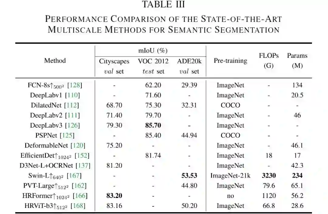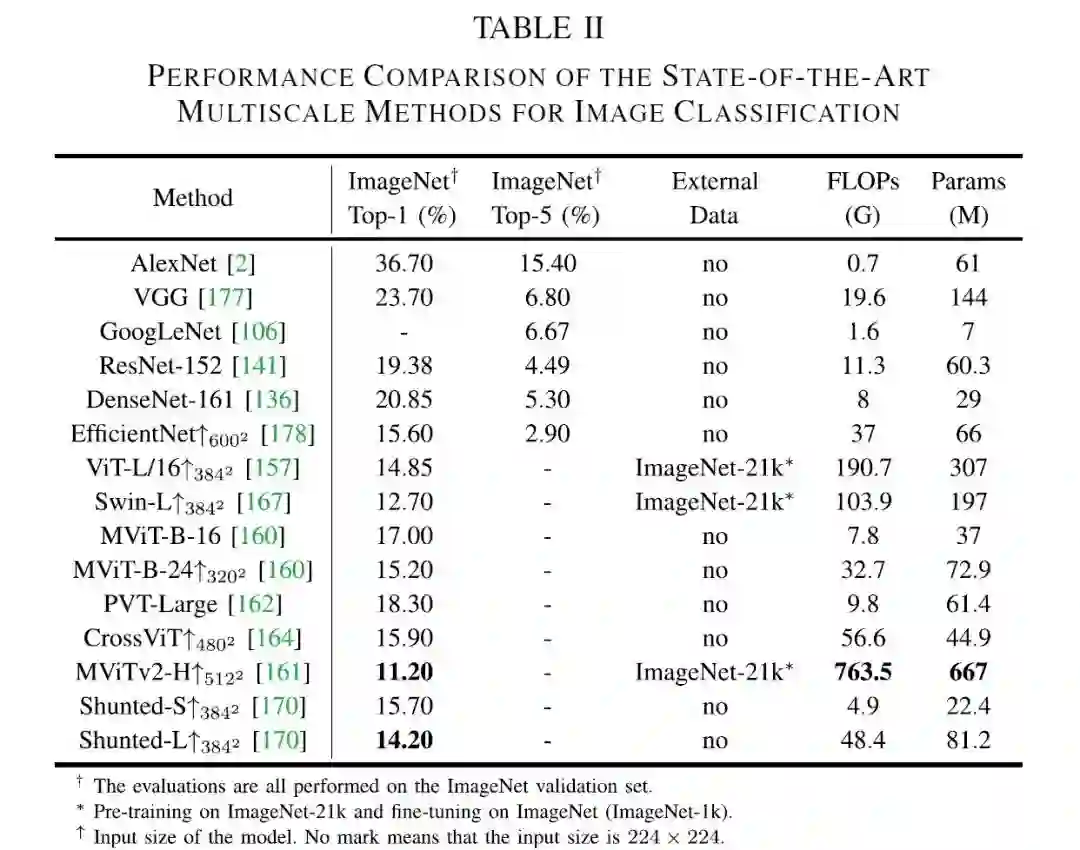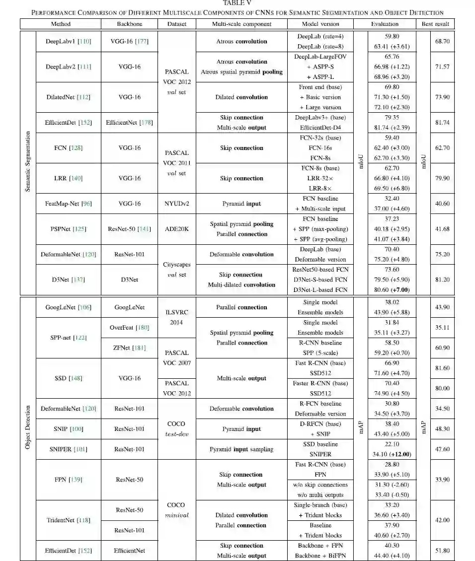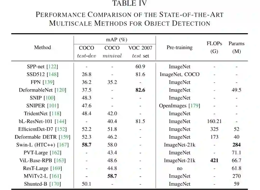 5.2. 多尺度视觉Transformer Transformer 的本质是一个编码器-解码器结构,核心是自注意力机制。它最初用于自然语言处理,后来被推广到计算机视觉领域。在编码器和解码器中,主要的组成部分是多头注意力和全连接前馈网络。其中,多头注意力由若干个并行的可伸缩点乘注意力层组成,其好处在于可以让模型关注到位于不同子空间的特征。 在2020年,Carion 等人 [156] 将 CNN 的特征提取骨干和 Transformer 的编码器-解码器结构结合起来,提出了端到端的目标检测网络 DETR,并将其泛化到全景分割任务。DETR 在检测大目标时表现得很好,但在小目标上性能稍逊,这是因为 Transformer 的注意力模块在处理高分辨率特征图时具有很大的局限性。为了解决这一问题,Zhu 等人 [159] 受到可变形卷积的启发,提出了一种可变形注意力模块,对参考点周围的一小部分关键点进行采样,从而缓解特征空间分辨率的问题。作者将可变形注意力模块扩展到聚合多尺度特征,并用其来代替原始的注意力模块。 Fan 等人 [160] 将 CNN 结构中的多尺度特征思想与 Transformer 进行结合,提出了多尺度视觉Transformer (MViT),用于视频和图像识别。MViT 通过多个通道分辨率尺度阶段来实现多尺度特征提取,其浅层用来建模高分辨率低级视觉信息,深层用来处理低分辨率的高维特征。后来,Li 等人 [161] 提出分解相对位置嵌入和残差池化连接对 MViT 进行了改进。Wang 等人 [162] 提出了金字塔视觉 Transformer (PVT),该架构采用渐进收缩金字塔来减少大型特征图的计算,可以用来替代 CNN 骨干网络。Zhang 等人 [163] 对ViT进行优化,将其升级为高效 ViT (E-ViT),通过连续使用多个 E-ViT 模块来构建多尺度视觉 Transformer。 Chen 等人 [164] 提出了一个双分支 Transformer 来处理不同大小的图像块,从而产生不同尺度的图像特征。通过交叉注意力来学习这些多尺度特征。Yuan 等人 [166] 受到 HRNet 的多尺度并行设计思想的启发,提出了高分辨率 Transformer (HRFormer),学习用于密集预测任务的高分辨率表示。不同于 HRFormer 中使用 Swin Transformer 块来替代 HRNet 中的残差块,Gu 等人 [168] 提出了一个结合 HRNet 的纯 ViT 骨干网络,该网络具有新的异构分支设计,性能更好。 Zhang 等人 [169] 将 ResNet 的网络结构与 Transformer 结合,提出了 ResT,该网络使用四个阶段构建多尺度特征图,使用空间注意力构建位置编码,可以灵活处理任意大小的输入图像。在原始 ViT 模型的自注意力模块中,每个 token 特征具有相似的感受野,这会限制模型对多尺度特征的捕捉能力。为了解决这一问题,Ren 等人 [170] 提出了一种分流自注意力 (SSA),通过对多个注意头进行分组来实现多尺度注意力机制,从而有效建模多尺度对象。 6. 方法比较 首先,对前文中介绍的多尺度深度学习方法的 SOTA 结果进行总结,涉及到的计算机视觉任务有图像分类、目标检测、语义分割。然后,在最具有多尺度表示需求的目标检测和语义分割方法上进行更为细节的讨论。具体来说,对多尺度 CNNs 中不同多尺度组件和其性能提升展开研究。