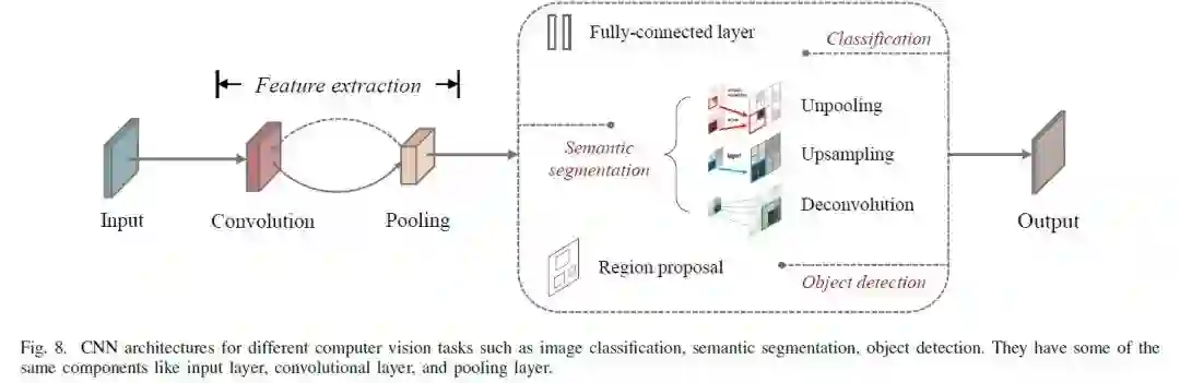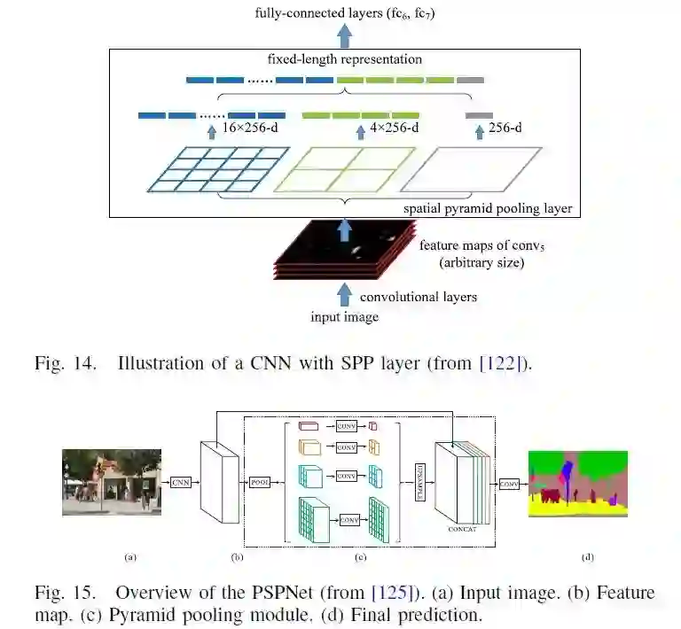 5.1.3. 池化 为了解决 CNN 固定尺寸输入导致忽略尺度多样性的问题,He 等人 [122] 基于传统的空间金字塔特征提取方法提出了空间金字塔池化 (SPP)。通过将最后一个池化层替换为 SPP 层,不同尺度的特征得以聚合并生成固定长度的输出,然后将其输入到全连接层。在目标检测任务中,SPPNet 从特征图的候选区域中提取窗口级特征,而不像 RCNN 直接从图像区域中提取特征。后来,Zhao 等人 [125] 将 SPPNet 应用于语义分割中,提出了金字塔场景解析网络 (PSPNet)。该网络通过金字塔池化模块将不同尺度的上下文信息进行聚合,从而获得包含局部和全局信息的特征表示,为像素级预测提供了良好的框架。