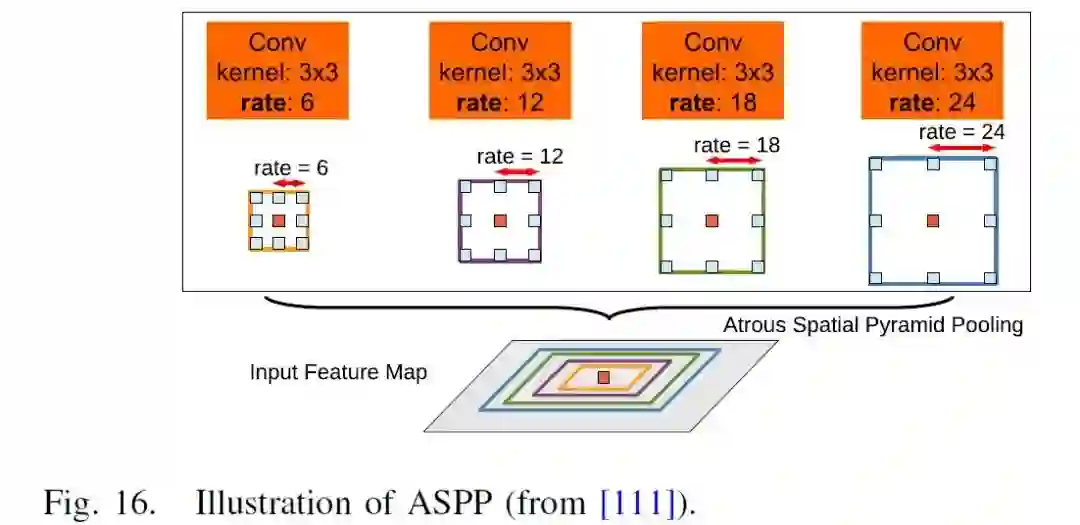 在 DeepLabv2 中,作者将 SPP 和空洞卷积进行结合,提出了空洞空间金字塔池化 (ASPP) 来解决目标的多尺度问题。为了对位于特征图中心的像素进行分类,ASPP 使用多个具有不同空洞率的并行空洞卷积层对不同尺度的上下文特征进行提取,并在各自的分支中进行处理,最后进行融合来生成最终结果。虽然 ASPP 可以有效地利用多尺度信息,但是在空洞率过大时,卷积核上的有效权值会变得很少,此时卷积核退化为 1×1 的滤波器。为了克服这一问题,Chen 等人 [126] 采用了PSPNet 中的全局特征提取方法,对 ASPP 进行改进,在最后一个特征图上应用全局平均池化来获得图像级信息。此外,他们还将批量归一化加入到 ASPP 中。这些改进使得模型的性能有了显著的提升。