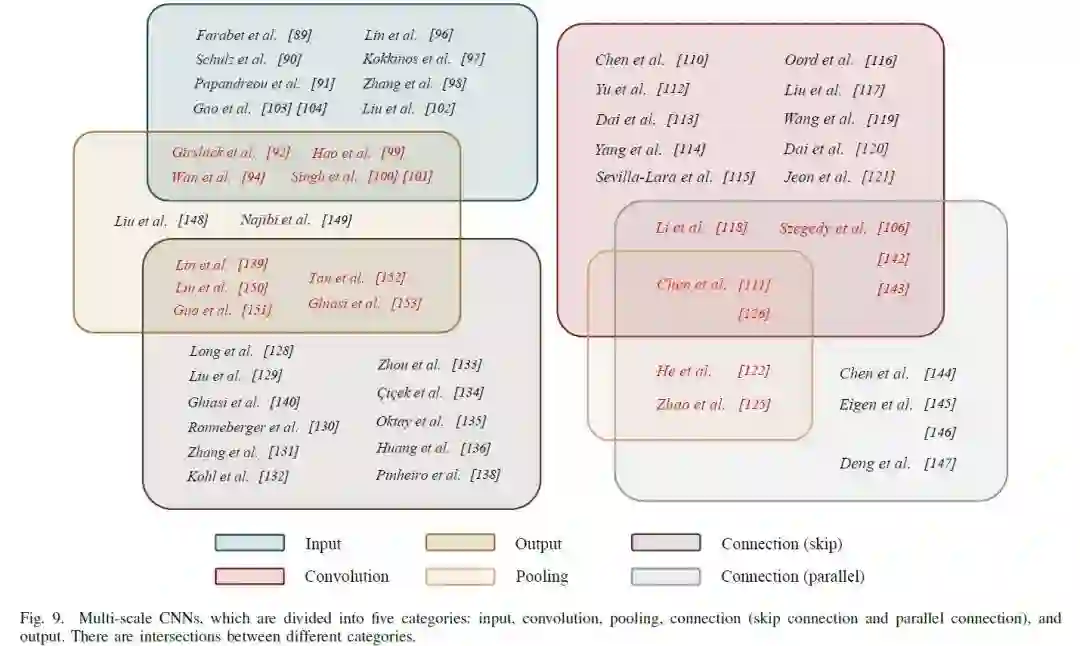 下面,我们将多尺度 CNNs 放入 CNN 经典架构中,得到自然的分类结果。具体分为输入、卷积、池化、输出,以及层与层之间的连接,每种分类的代表性方法如图9所示。这可以涵盖绝大多数现有的多尺度方法。